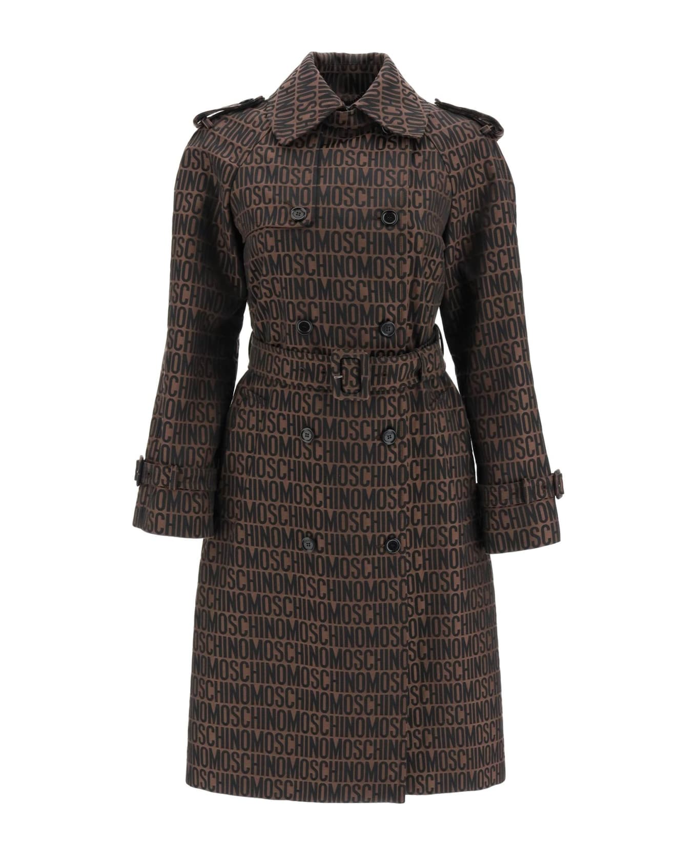 Cotton blend jacquard Moschino trench coat with all-over logo pattern. It features a pointed collar with chin strap, back yoke, double-breasted button closure, adjustable buckled straps at cuffs and shoulder epaulettes. Provided with a matching buckle-belt. Regular fit. The model is 177 cm tall and wears a size IT 40.