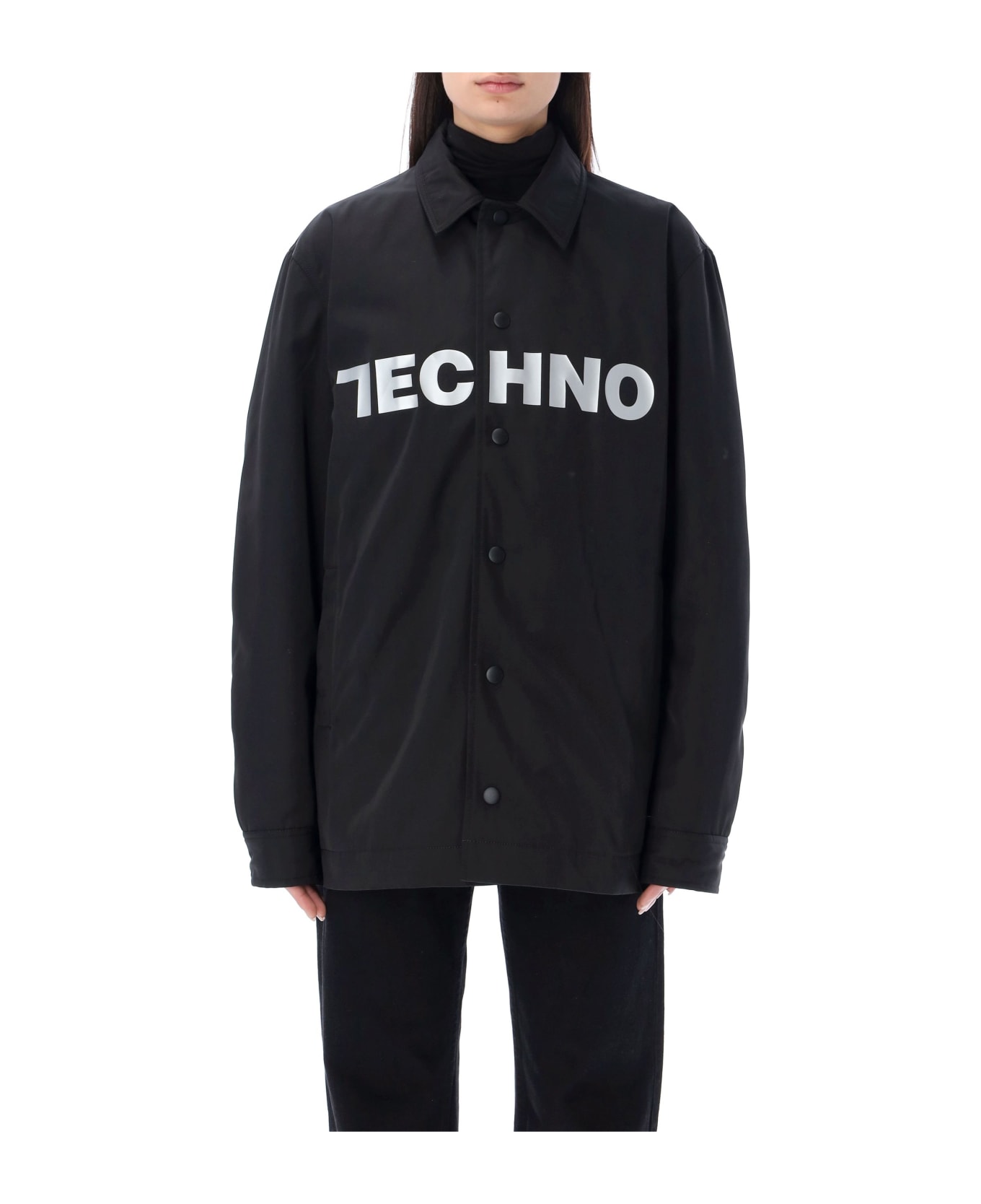 Techno Jacket By 1017 Alyx 9sm. Featuring: Spread Collar Snap Buttons Fastening Silver-toned Techno Print At Front Side Slit Pockets Button Cuffs Silver-toned Logo Print At Back Straight Hem The Model Is 1,72m Tall And She's Wearing Size S The Model Is 1,90m Tall And He's Wearing Size M