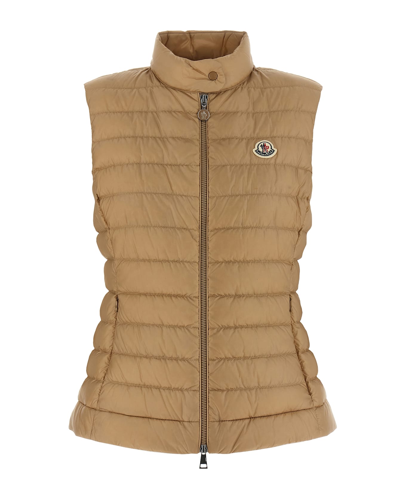 'Igens' vest in water-repellent saison longue quilted and slightly padded with goose down, felt logo patch and front zip closure, high neck with snap button closure, nipped waist, pockets.