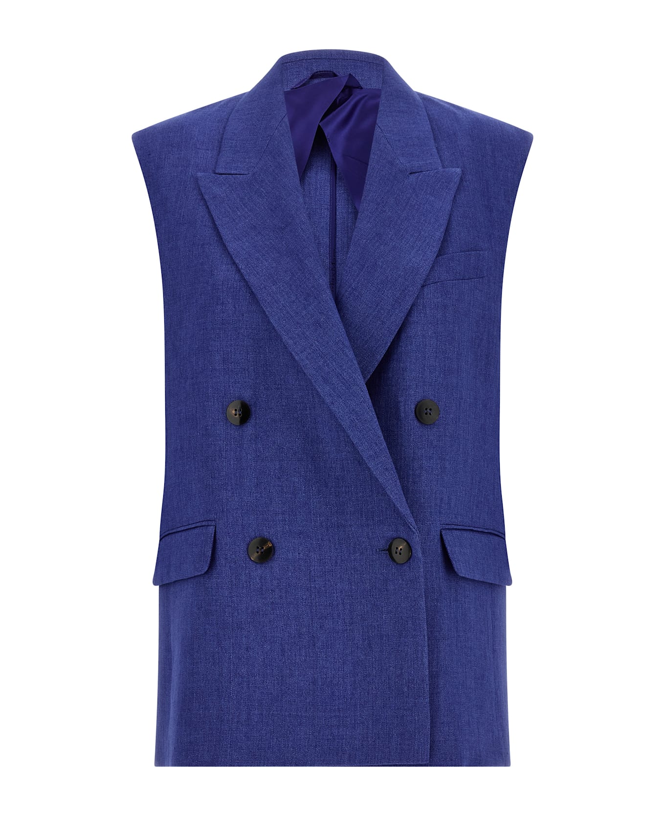 'MstAia' waistcoat in pure linen délavé batavia, double-breasted blazer model of sartorial inspiration with front horn button closure, peak lapels, chest pocket, flap pockets, back split, cupro and viscose blend half lining. Composition: 100% linen