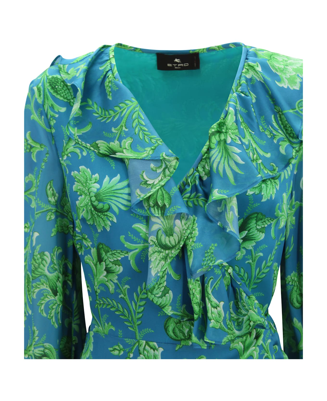 Features Fabric: Peau d Ange silk All-over floral motif Regular fit V-neckline with ruffles Long sleeves Extended back hem Matching waist tie belt Made in Italy