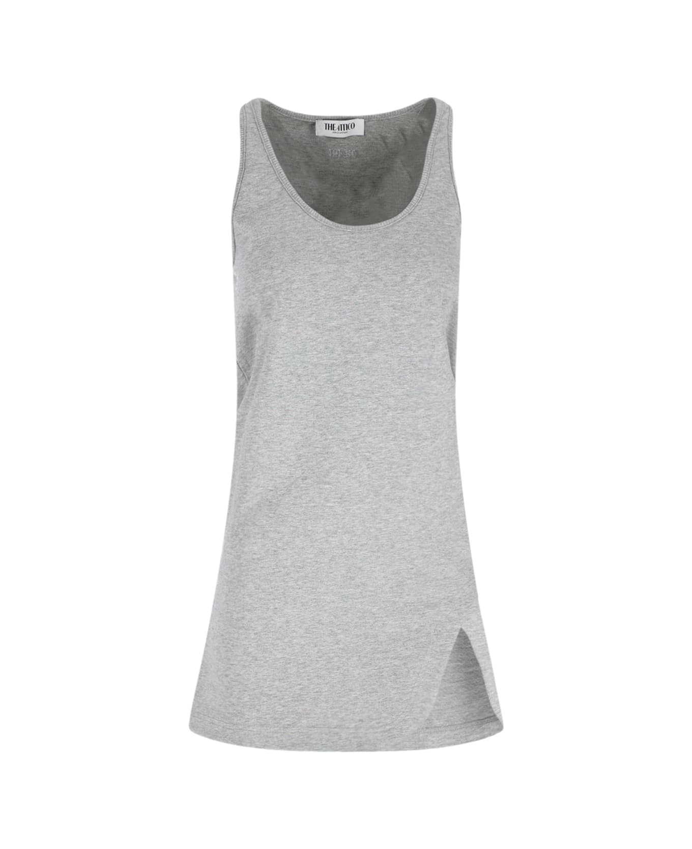 The Attico sleeveless mini dress in gray stretch cotton with side split detail, tone-on-tone logo embroidery on the back, and straight hem.