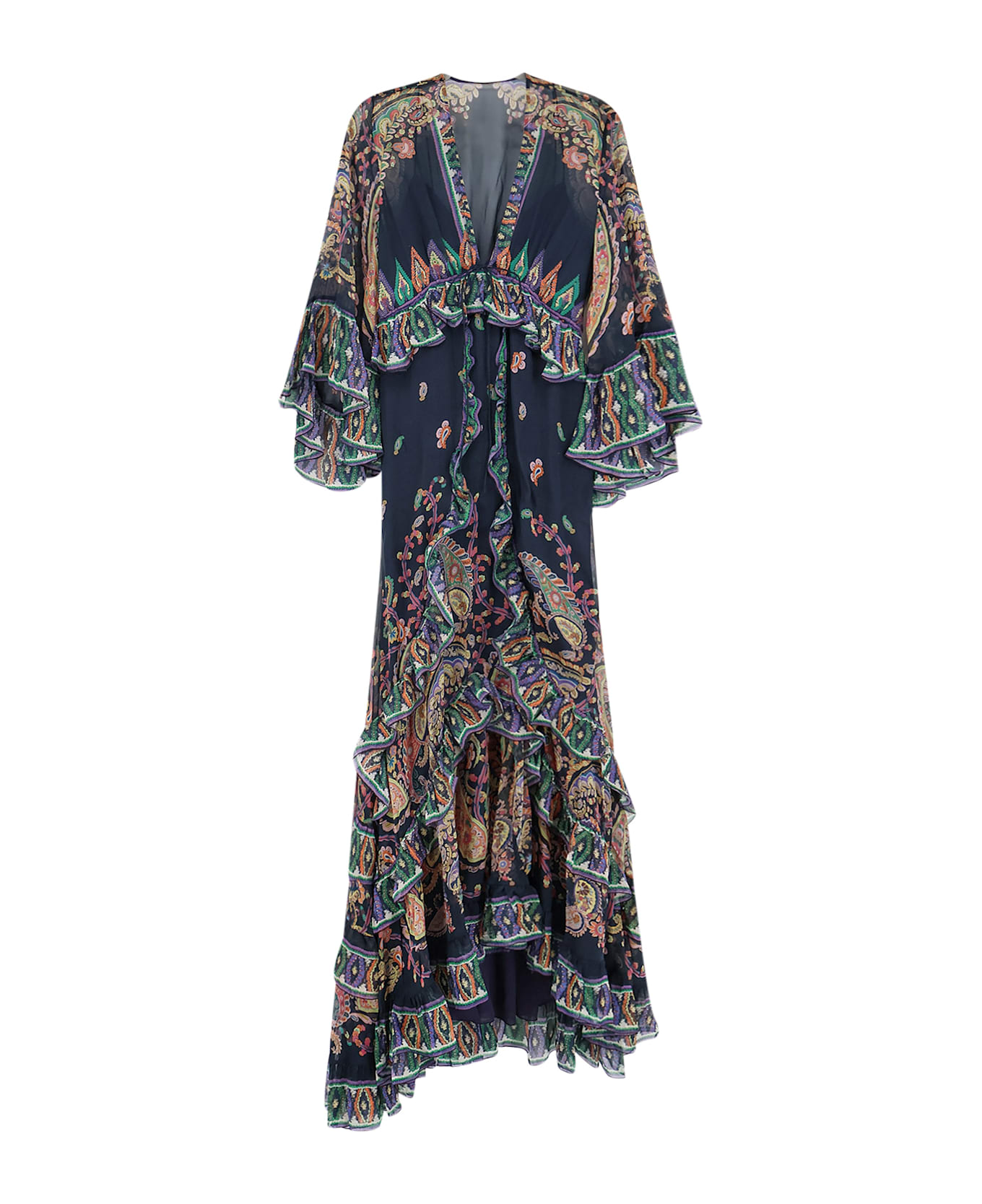 V-neckline Flared 3/4 sleeves Side zip closure Zipped petticoat Ruffled bottom Made in Italy 100% silk Lining: 100% polyester SKU: WRHA053799SP1K4X0883