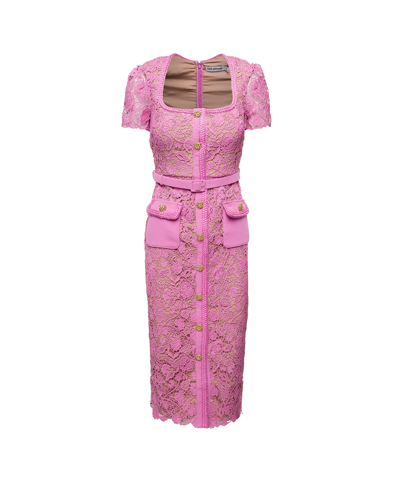 Midi dress Square neck Short sleeves Belt at the waist Two patch pockets Front buttons Lace overlay all-over Pink Polyester Regular fit