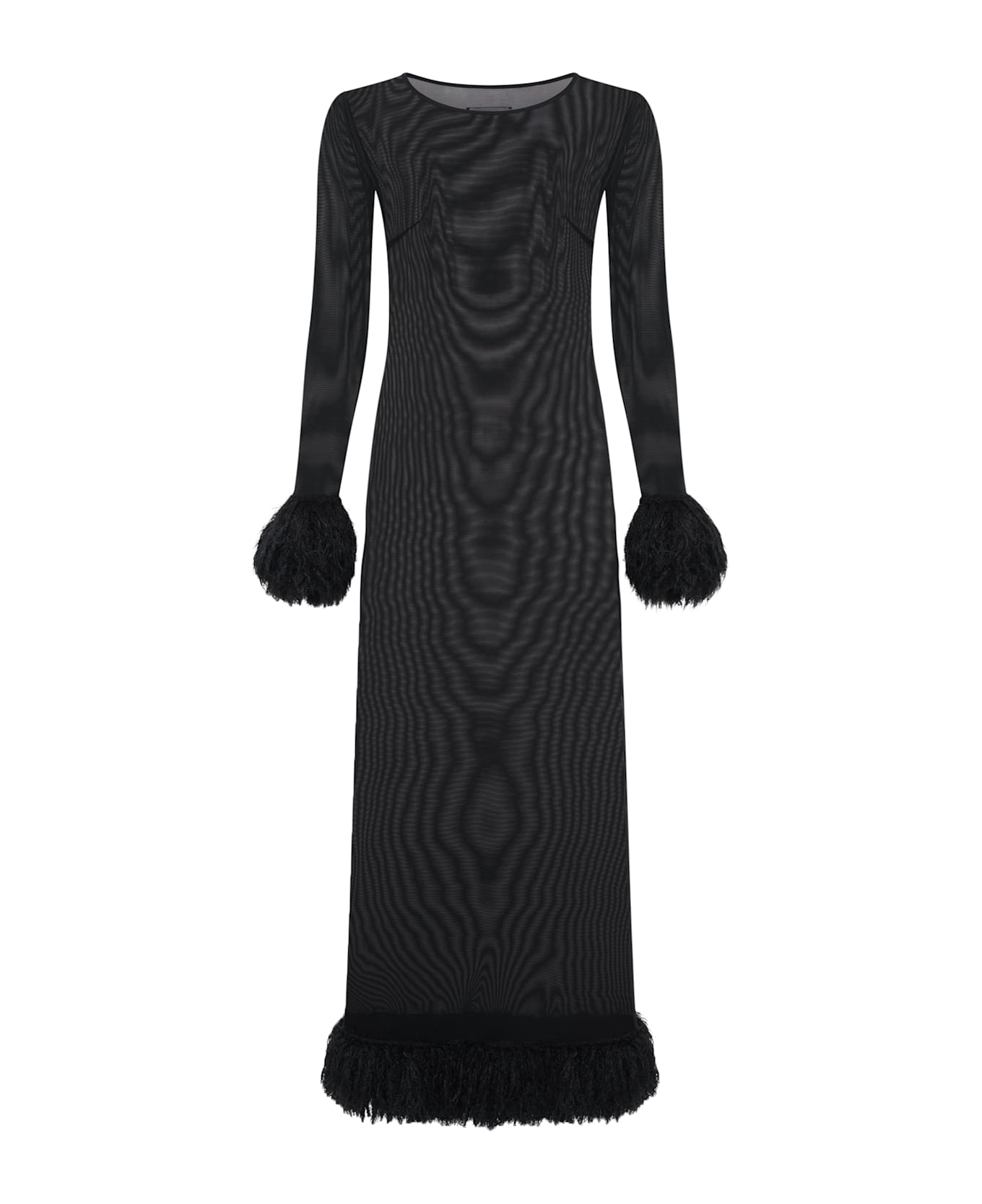 Marine Serre black mesh dress, crewneck, long sleeves, faux feathers at bottom, long model Composition: 86% Recycled Polyamide, 14% Elastane, 100% Polyester