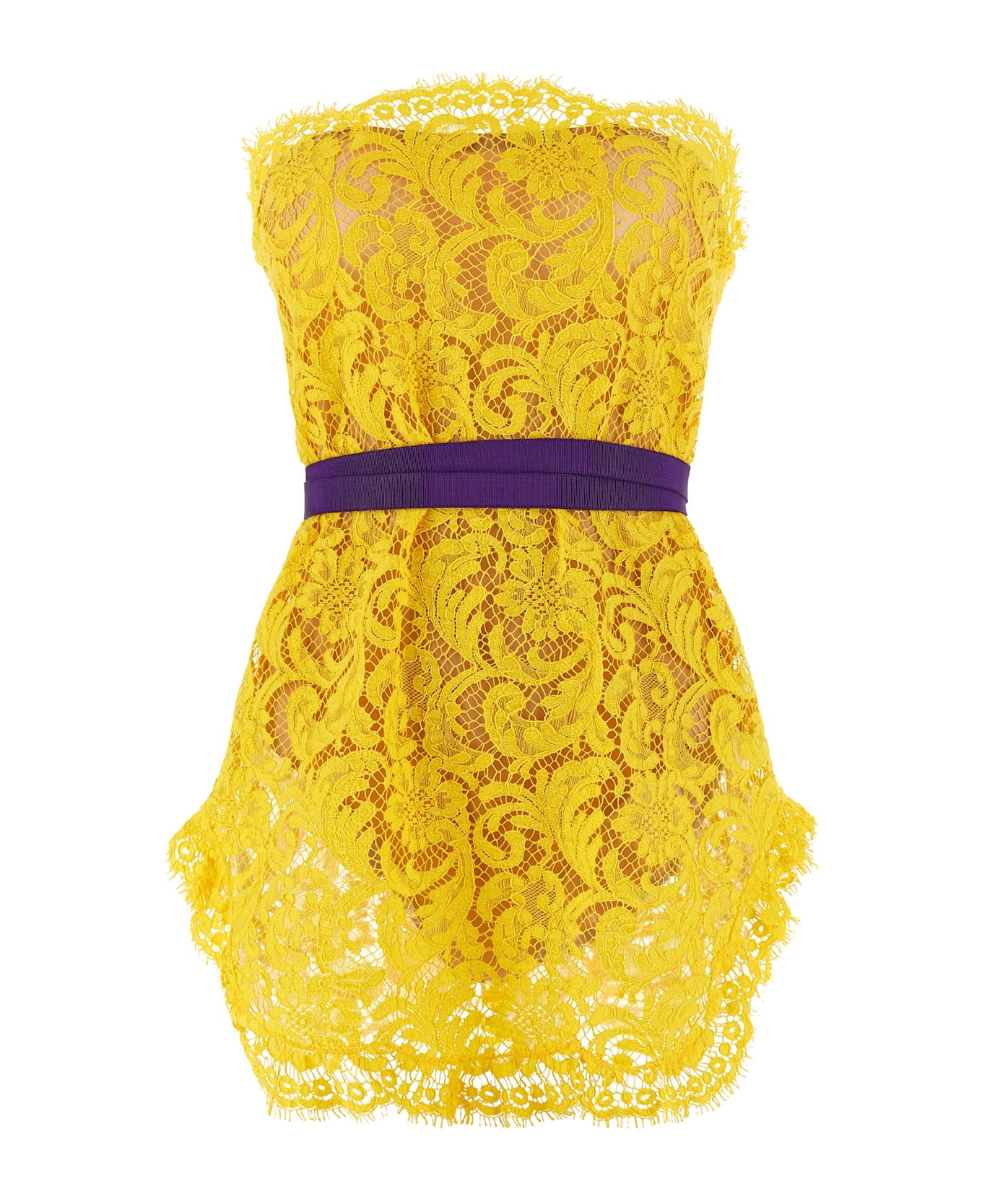 Sleeveless 'Sophie Lace' minidress in semi-transparent embroidered lace, off-the-shoulder bandeau model, rounded hem, back zip closure, removable flesh-colored bodysuit with snap buttons on the hem, removable contrast grosgrain belt.