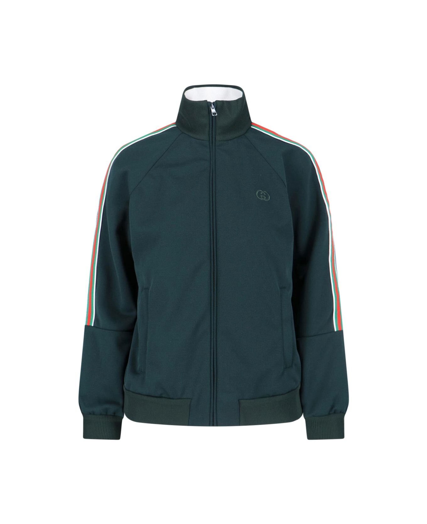 Gucci dark green technical jersey zip sweatshirt with zip closure, long sleeves, high neck, side Web ribbon details, tone-on-tone embroidered GG logo on the front, ribbed trim, straight hem. Composition: 100% Polyester