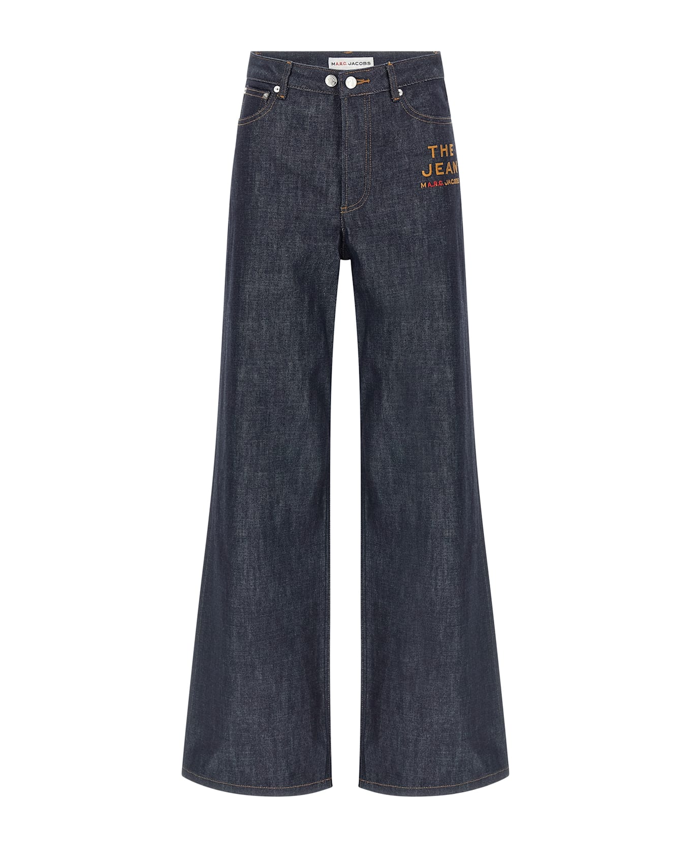 Marc Jacobs capsule 'The Jean' jeans A. P. C. in rigid cotton denim with contrast stitching, logo embroidery, front zip and button closure, five pockets, back leather logo tag, and wide, straight leg.