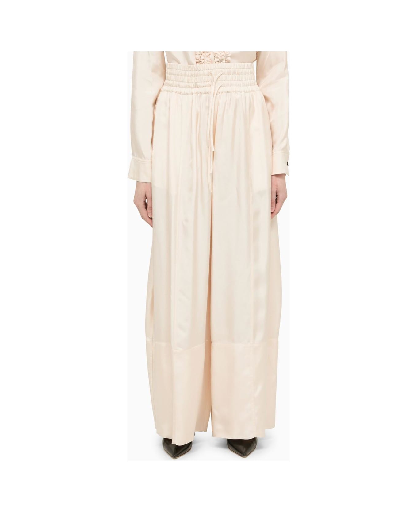 Ecru satin Jil Sander trousers featuring an elasticated waistband with double drawstring, two bellows pockets on the sides and a straight leg. Composition: 100% Viscose