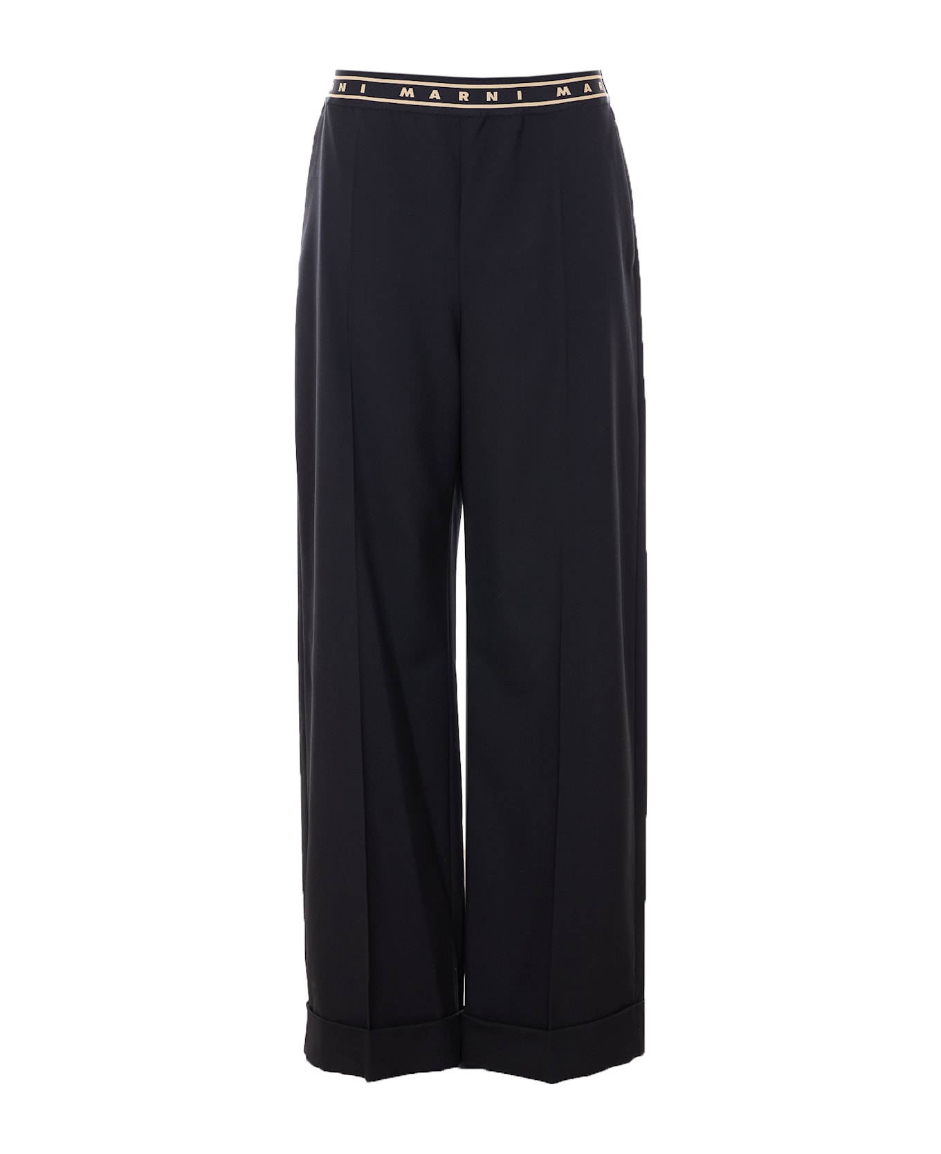 Marni black pants, elasticized on waist, lateral pockets, band logo, wide leg Composition: 100% Virgin Wool, 100% Viscose, 100% Cotton