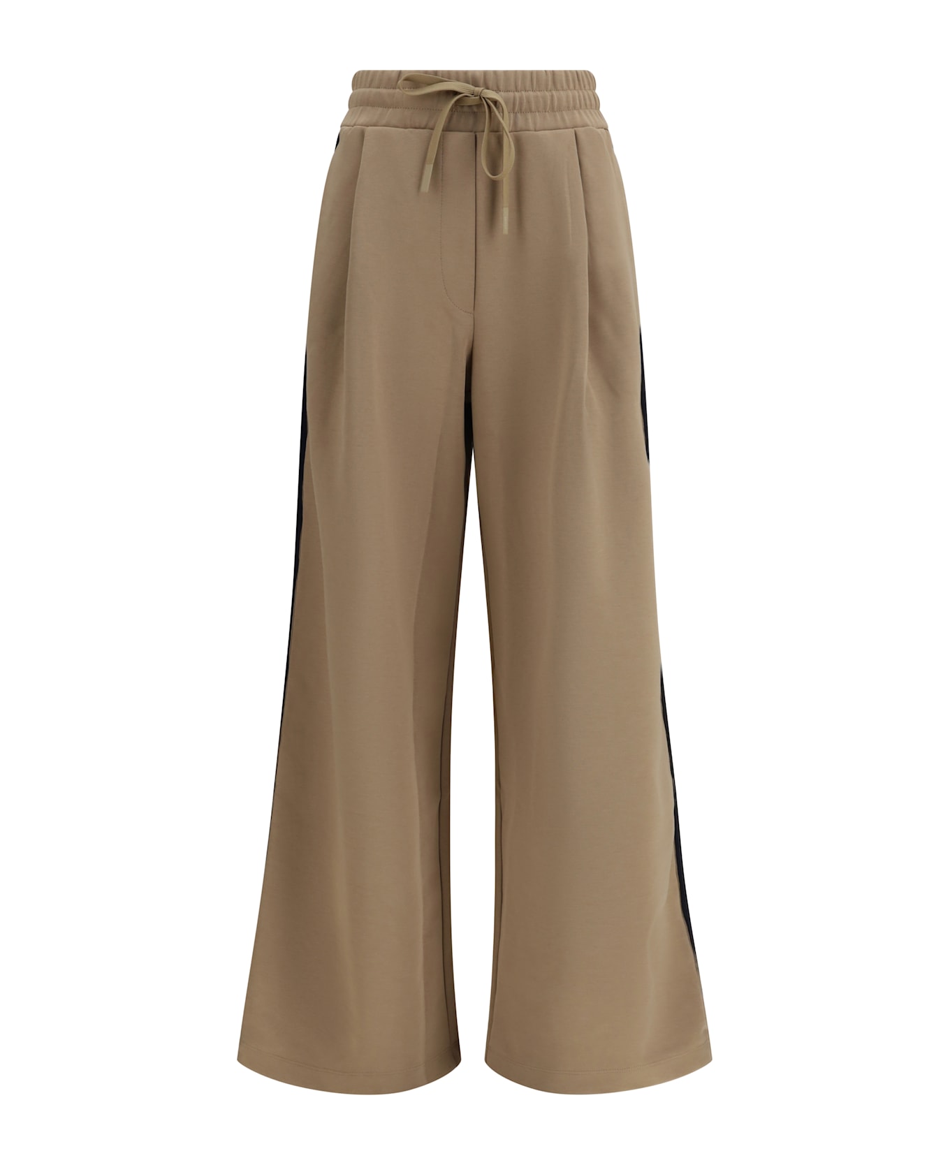 The perdoni pants by weekend max mara are crafted from cotton jersey and feature front pleats that shape the silhouette. they are designed with a wide leg and ivory and black side bands for a contemporary graphic touch. the mid-rise waist includes an elasticated band with adjustable drawstrings, while side welt pockets complete the functional design. regular fit.