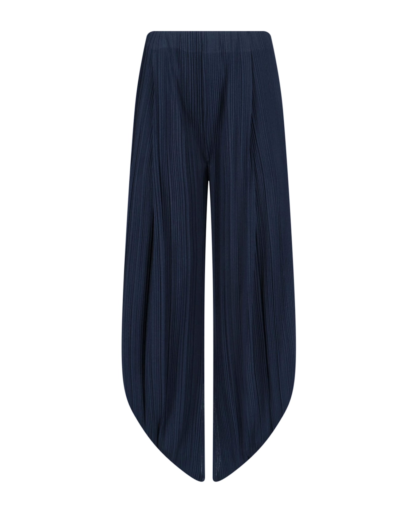 Giorgio Armani pleated pants in dark blue fabric with medium elastic waistband, two side pockets, rounded hem, wide leg.