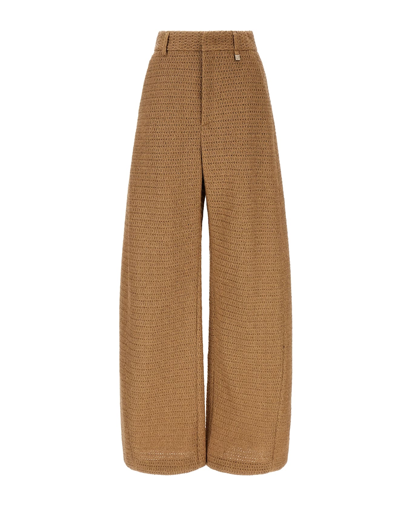 Braided raffia-effect fabric trousers, tailored model, wide leg, hook and front button zip closure, pockets, tone-on-tone semi-transparent organza lining. Handcrafted product, any imperfections are to be considered characteristics of uniqueness.