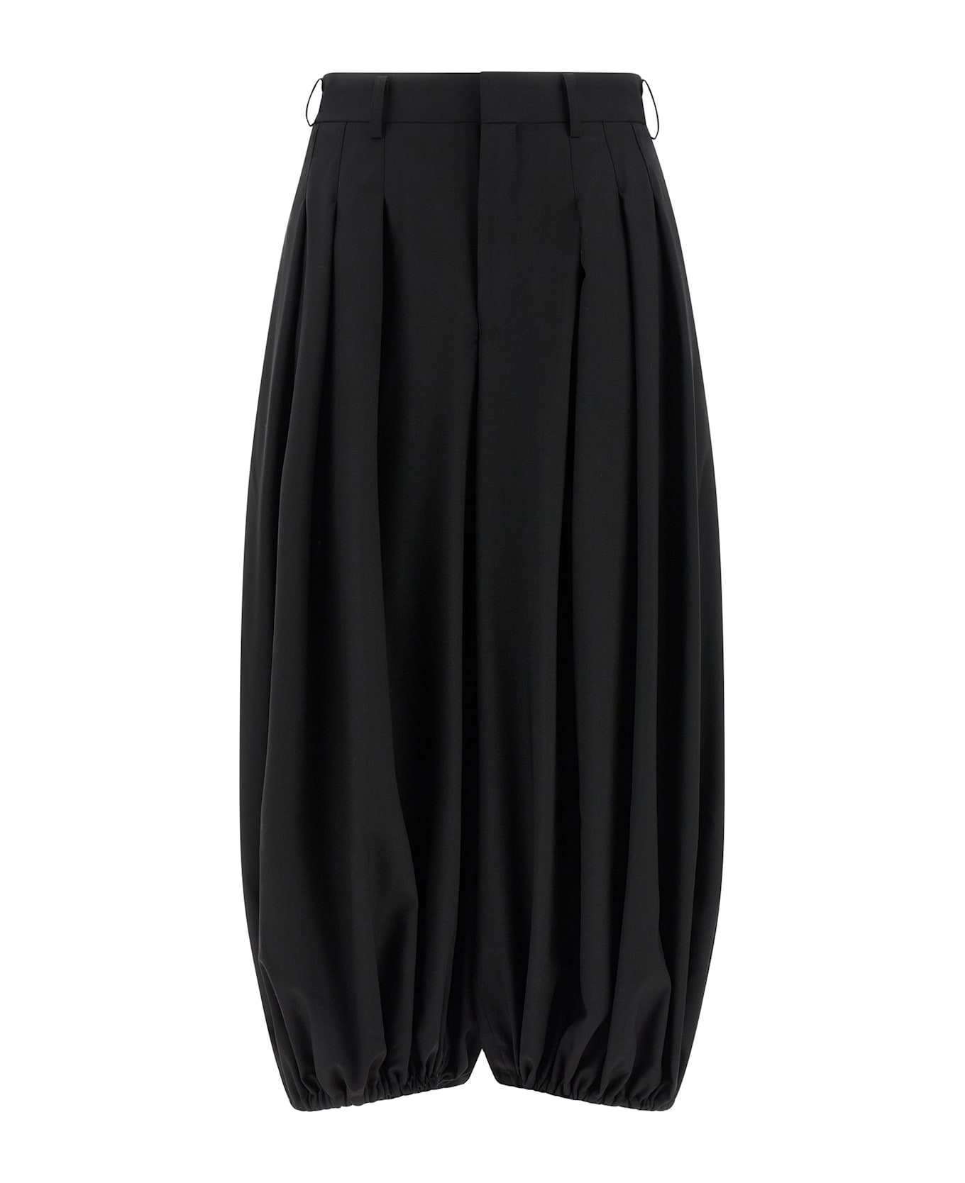 Zuava wool pants, extra wide leg, front and back pincer, zip hook and front button closure, pockets, elastic at the bottom of the leg.