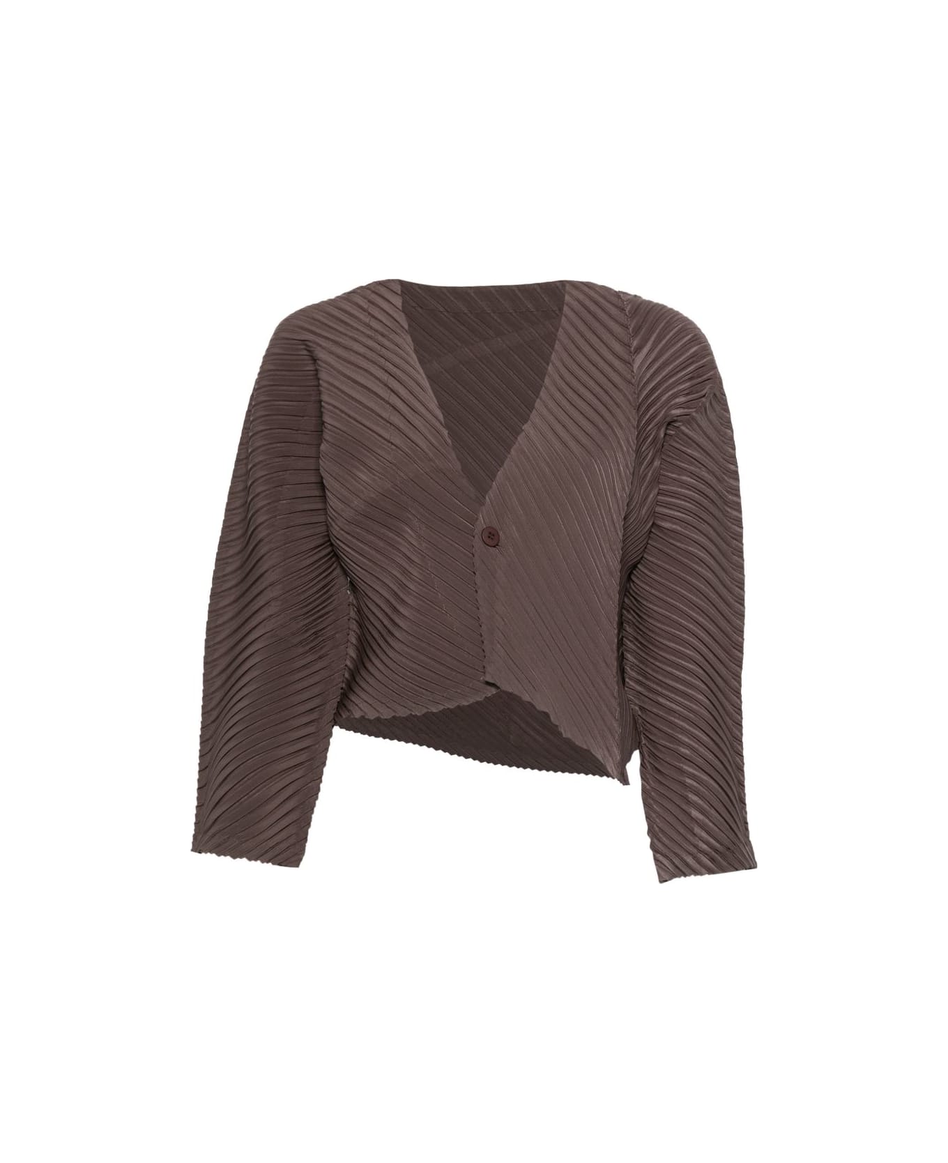 brown pleated V-neck button fastening three-quarter sleeves asymmetric hem