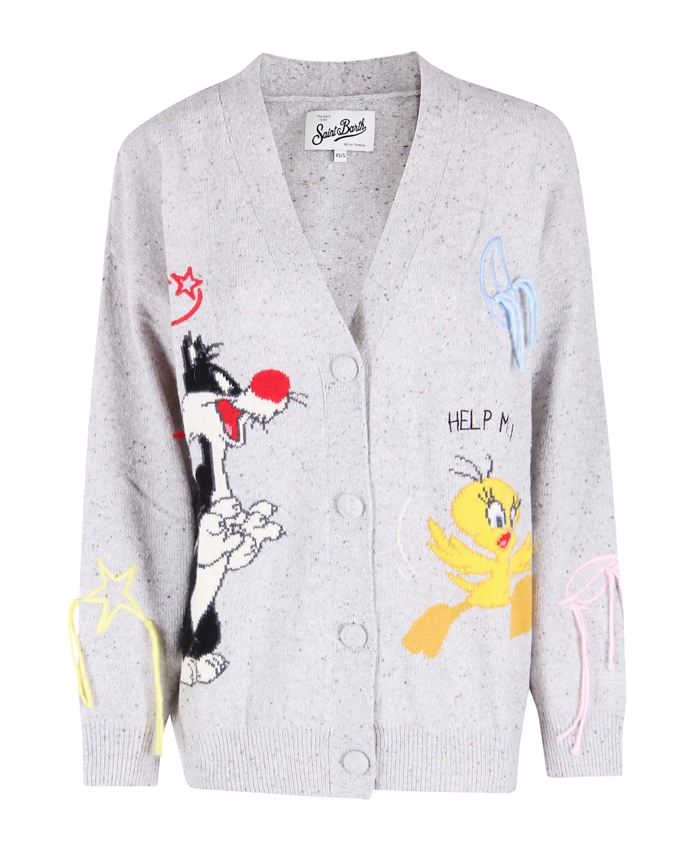 Cardigan -MC2 Saint Barth -Grey color -Long sleeve -V-neck -Tittles and Sylvester Cat embroidery -Central button closure