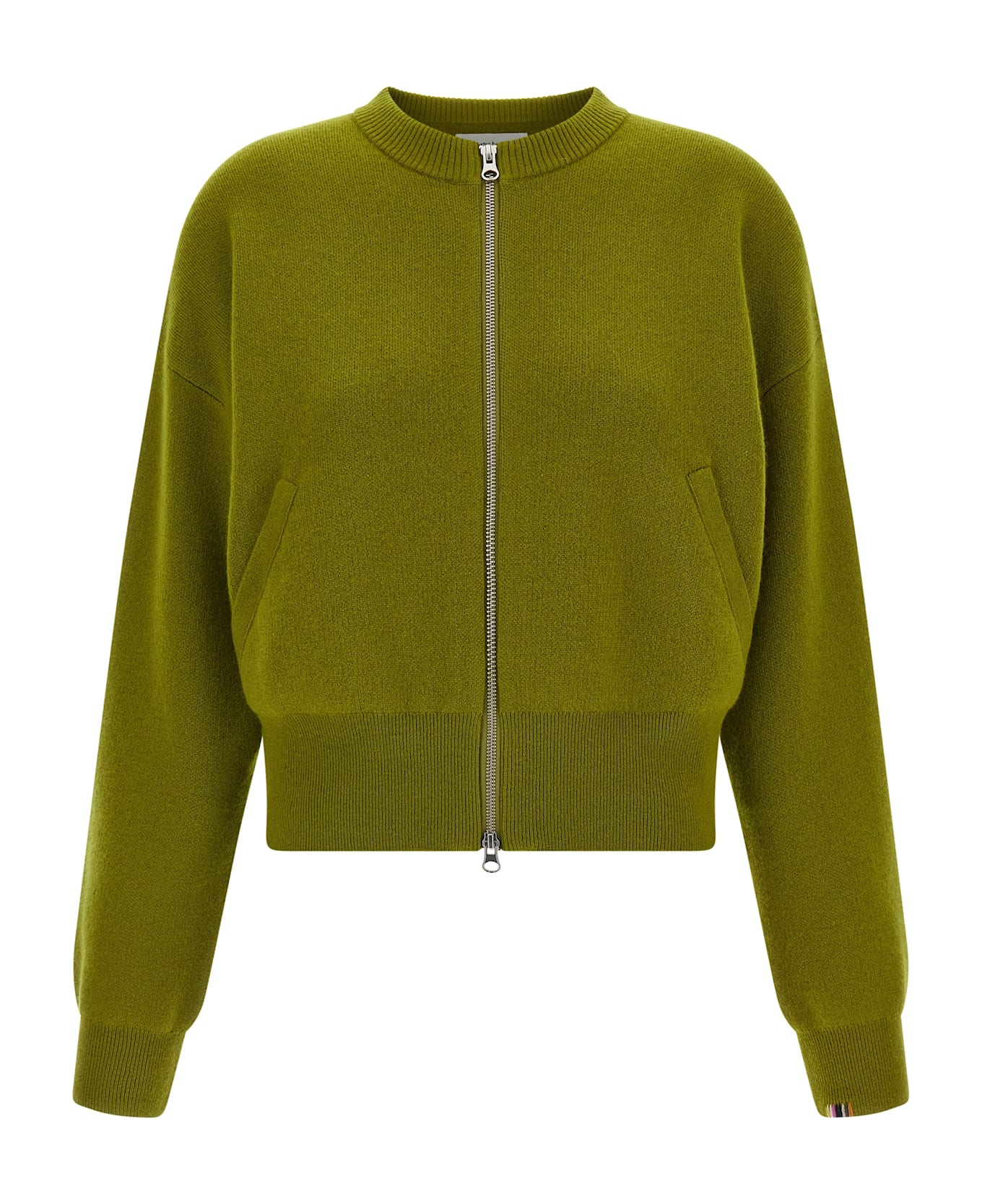 'N°478 Xtra Fun' cardigan in a luxurious jacquard sweater, slightly cropped bomber-inspired model, crew neck, front zip closure, pockets, long sleeves with cuffs and dropped shoulder, band on the hem.