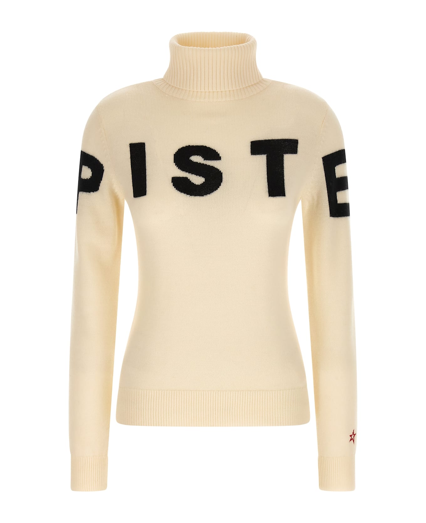 Piste' wool sweater with front jacquard pattern, turned-up high neck, long cuffed sleeves.