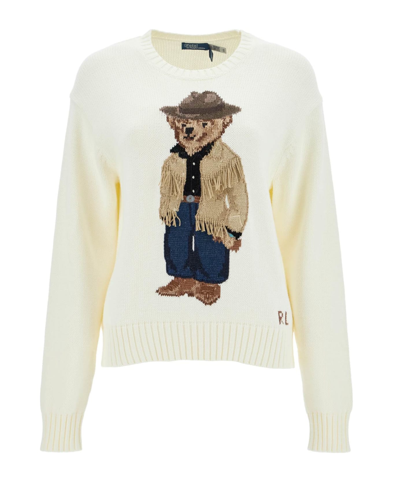 This Polo Ralph Lauren crewneck pullover is made of pure cotton and features an intarsia Polo Bear design on the front with embroidered details and small fringes. The edges are ribbed, and it has a relaxed fit with dropped shoulders. The model is 177 cm tall and wears size XS.