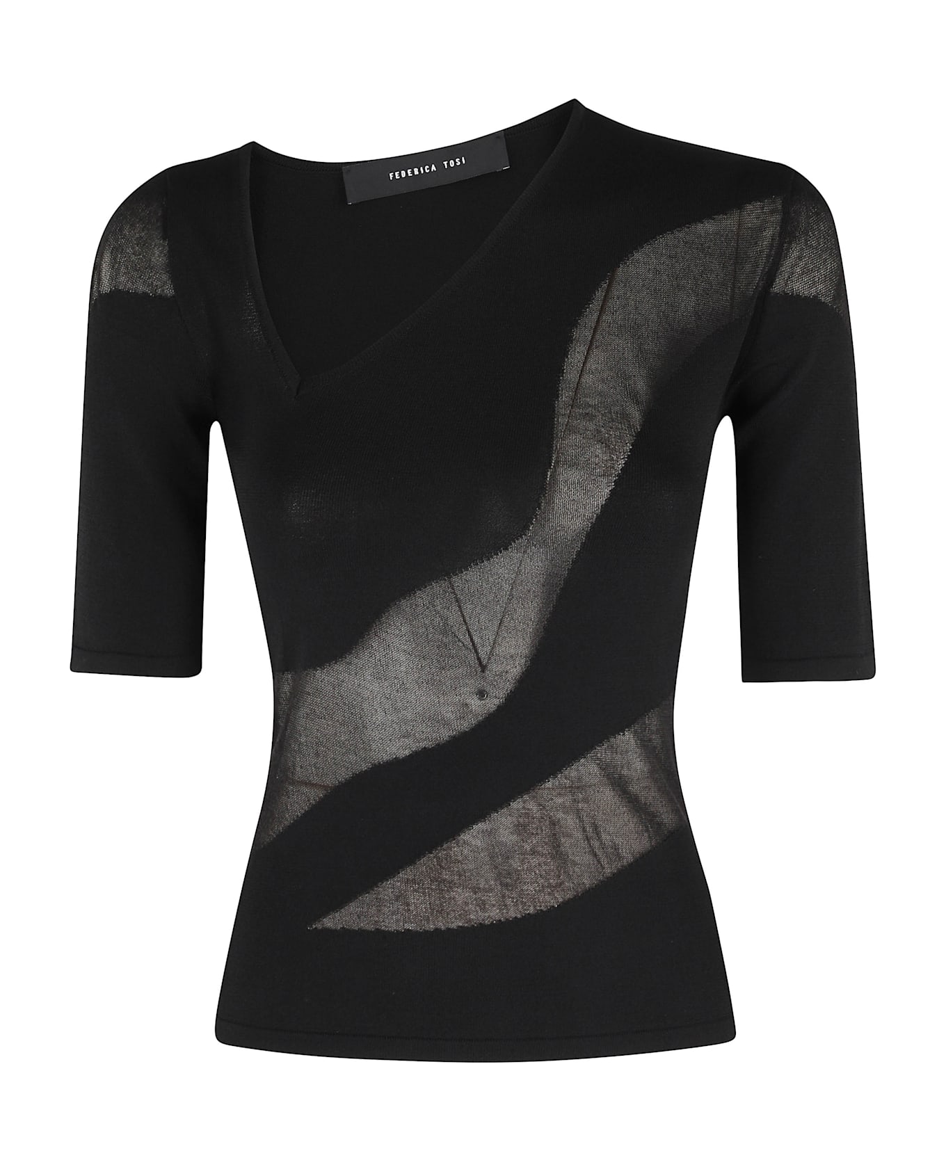 Category: Sweater Article: Asymmetrical Neckline Sweater Brand: Federico Tosi Color: Black Neckline: Asymmetrical V Details: Semi-sheer inserts, ribbed trim SIZE AND FIT Fit: Regular Sleeve: Short