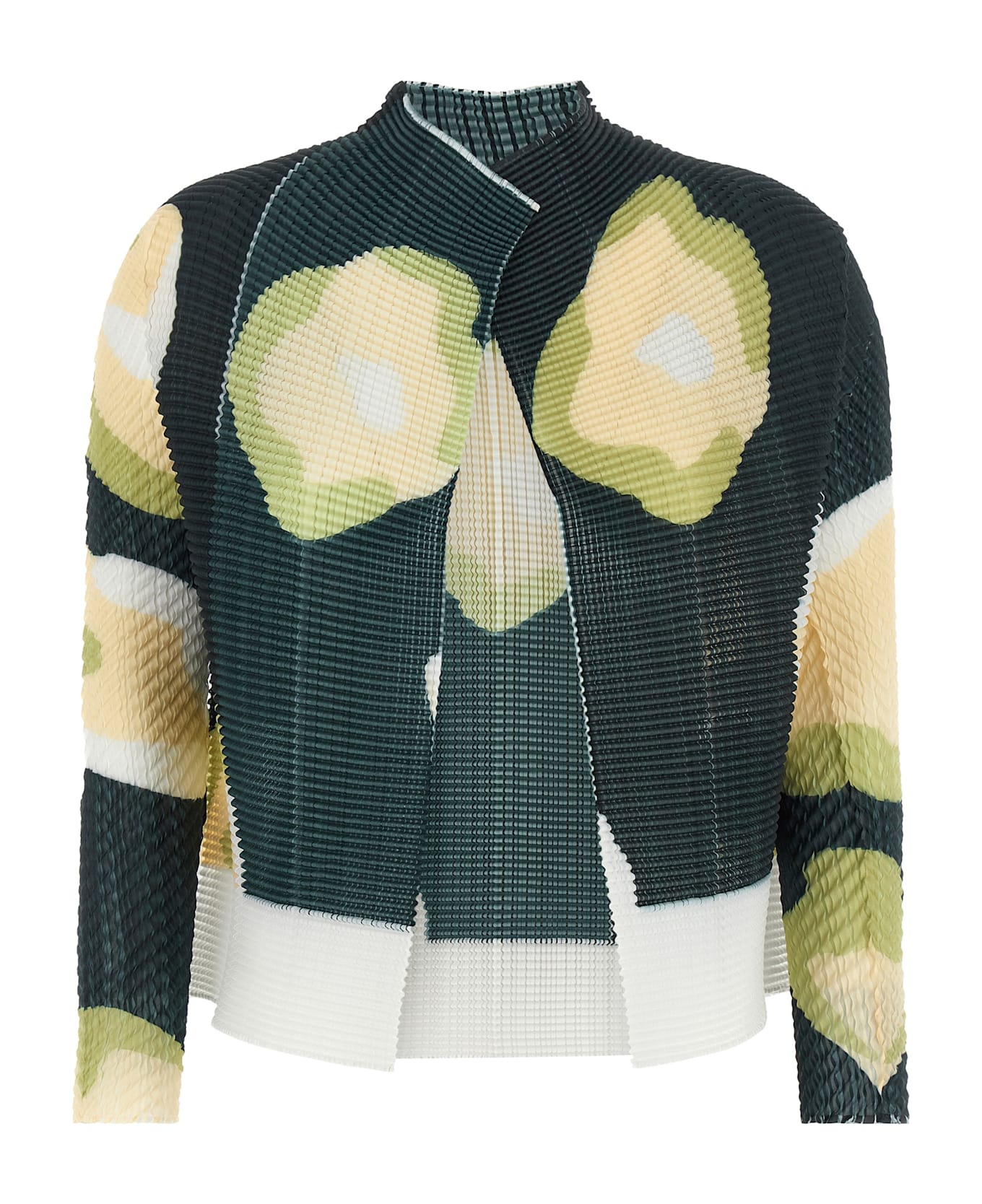 'Verve Pleats Top' cardigan in pleated fabric with all-over print, front opening, long sleeves. SUSTAINABLE: product made from recycled polyester.