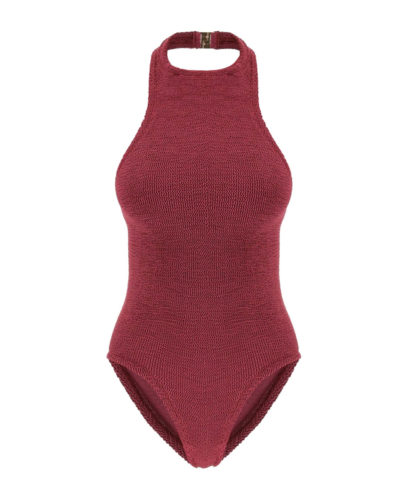One-piece swimsuit by Hunza Gcrafted in crinkle stretch fabric. Halterneck with rear hook closure, high-cut briefs and scooped back. One size.