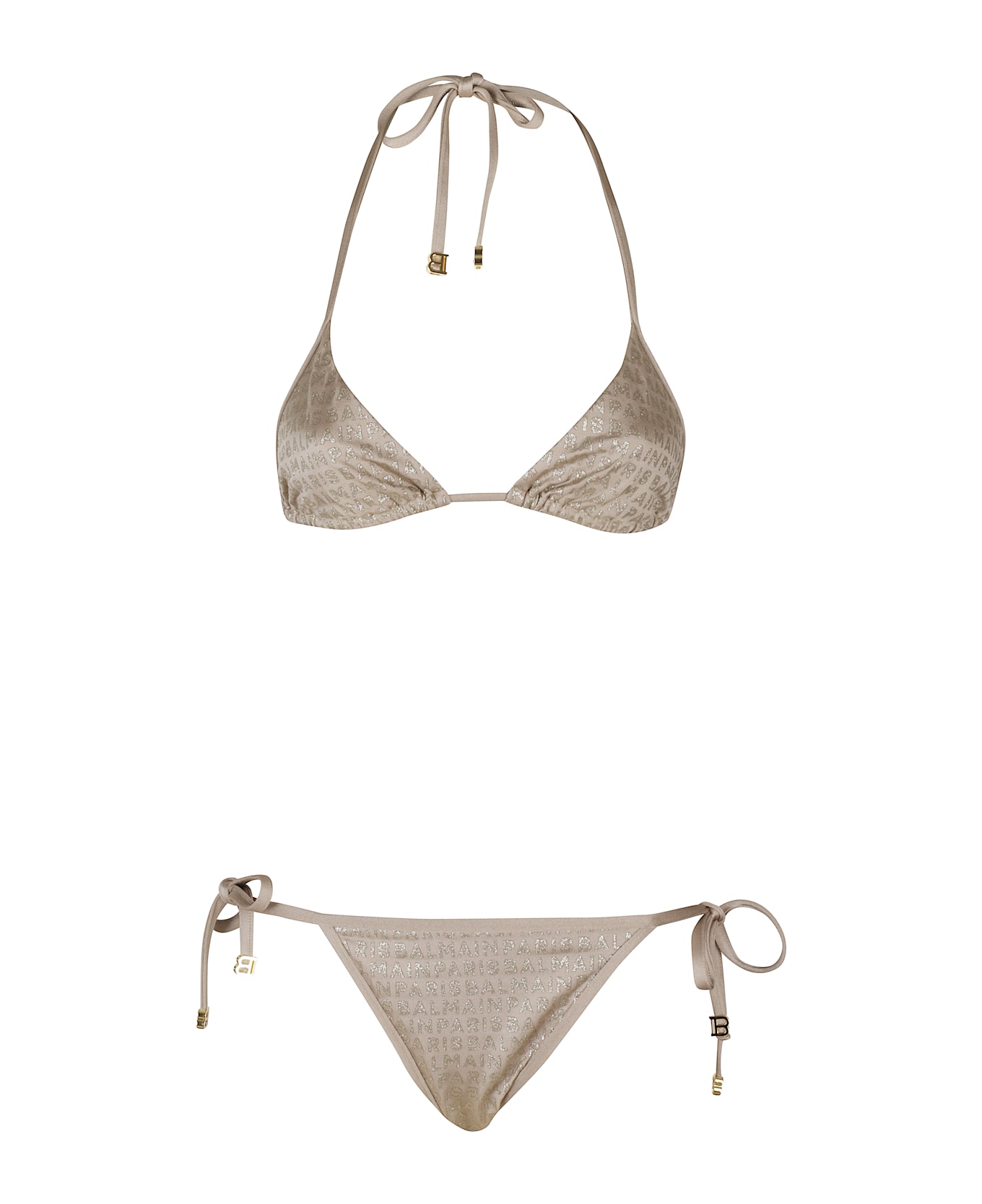 Bikini - Balmain - Gold color - All-over lurex logo fabric - Triangle pattern top - Self tie briefs