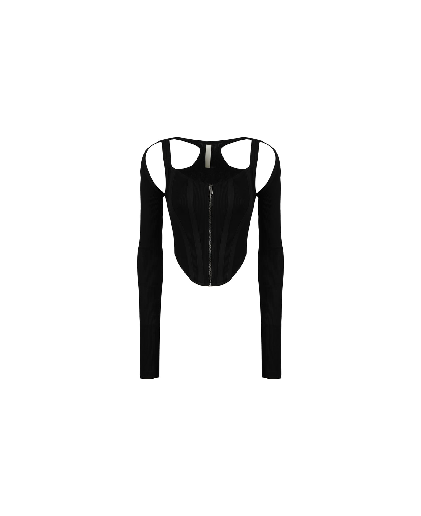 Black Shift Loop Corset Top from Dion Lee -Long sleeve corset top -Made from organic cotton ribbed jersey -Shoulder and back cutouts -Trimmed with ribbed binding -Inseam thumbholes -Snug fit with boning at front -Center front fastening with exposed zip -Colour: Black --98% Organic Cotton 2% Elastane