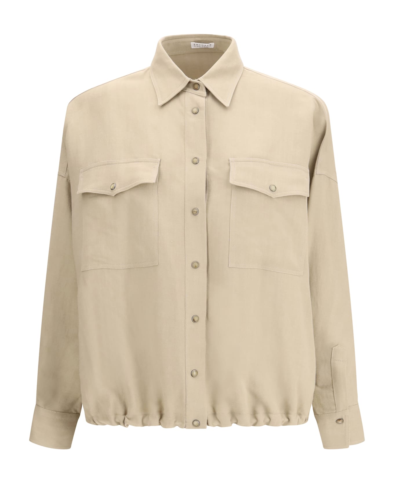 The viscose and linen fluid twill shirt by brunello cucinelli combines elegance and comfort with a sophisticated design. featuring a placket closure with snap buttons, a classic collar, and dropped shoulders, it offers a relaxed fit. the snap button cuffs, two patch pockets with flaps and buttons on the chest, and drawstring hem add practicality and style. a versatile and modern garment, perfect for any occasion.