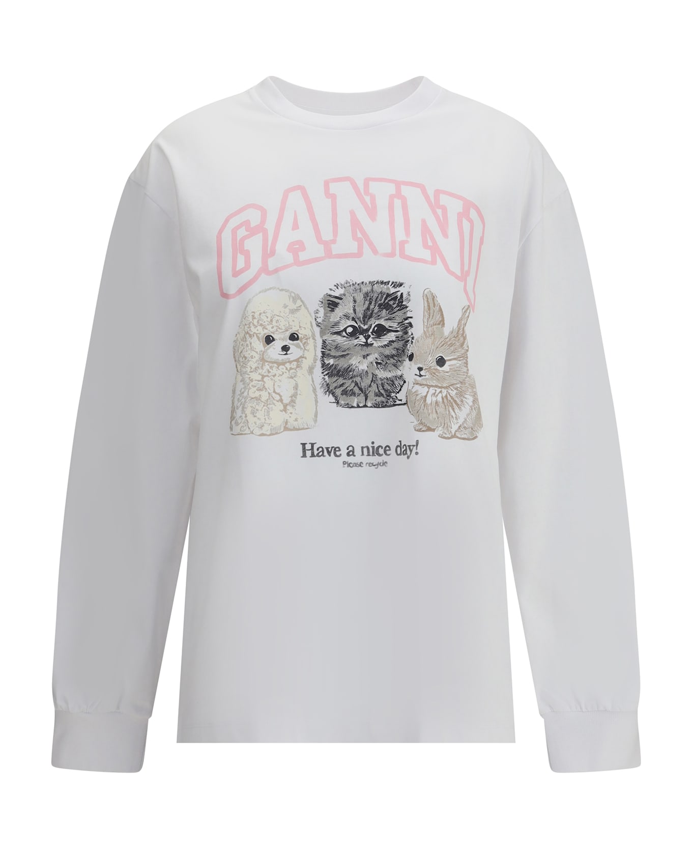 Ganni's "have a nice day" long-sleeved top combines style and environmental commitment. with its ribbed crew neck and front print depicting smiling animals accompanied by the phrase "have a nice day, please recycle," it is the perfect garment for fashionistas with a positive message. made of soft cotton, it lends an ironic and conscious touch to everyday looks. Composition: 100% % Cotton