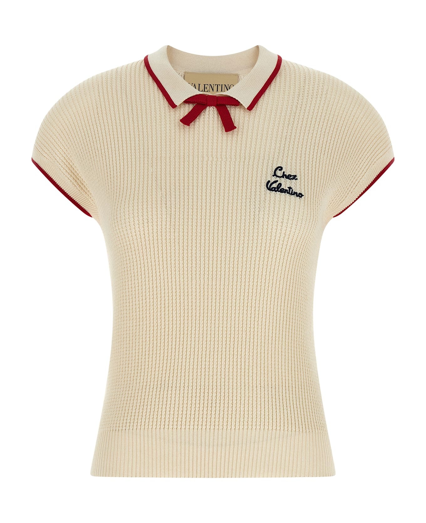 Knitted stretch cotton and viscose blend top with contrast details, 'Chez Valentino' embroidery and collar with bow detail at the front, short sleeves with cuffs, and band on the hem. Composition: 54% cotton 46% viscose