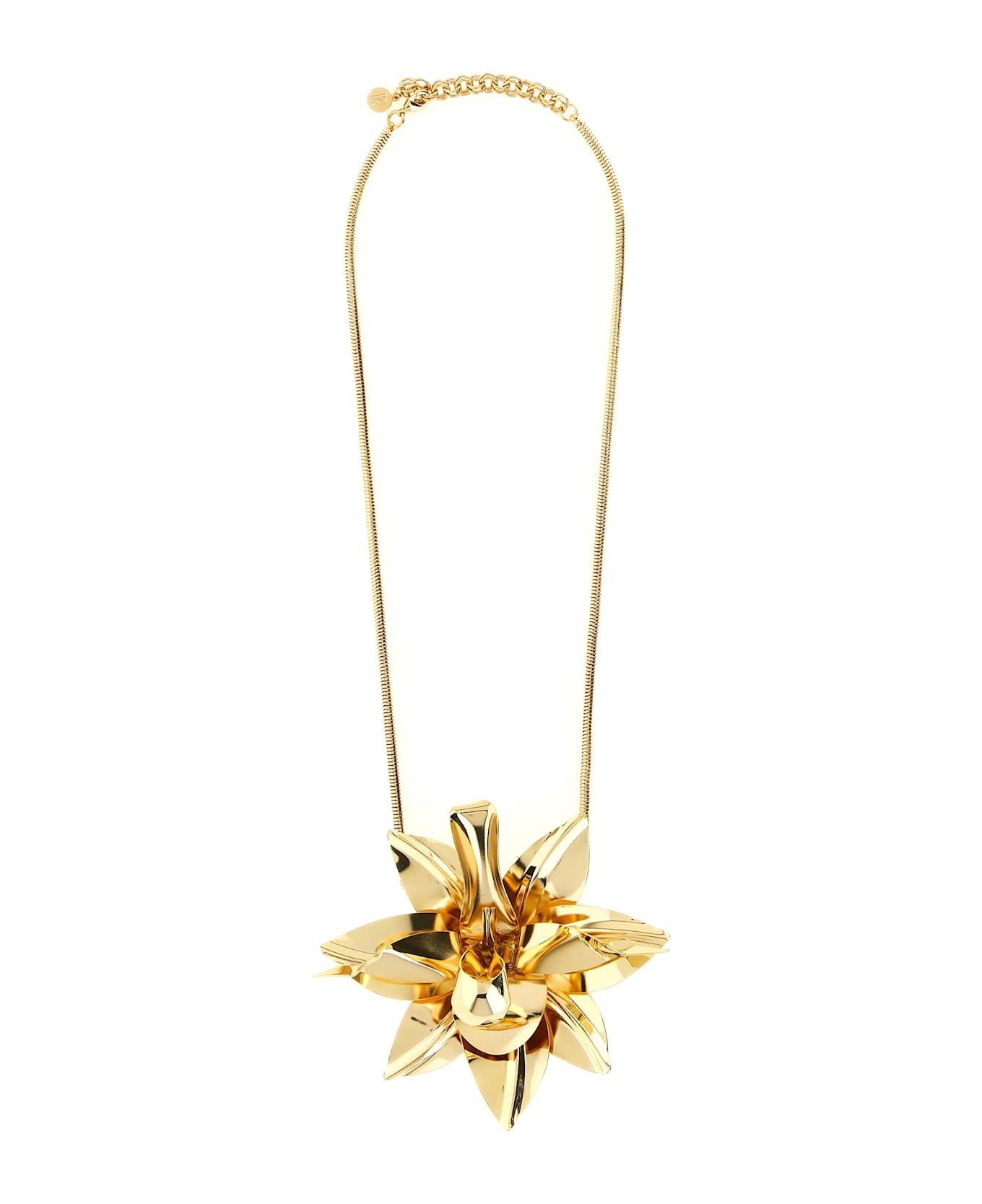 Gold-plated brass necklace with adjustable flower-shaped pendant and snap hook closure.