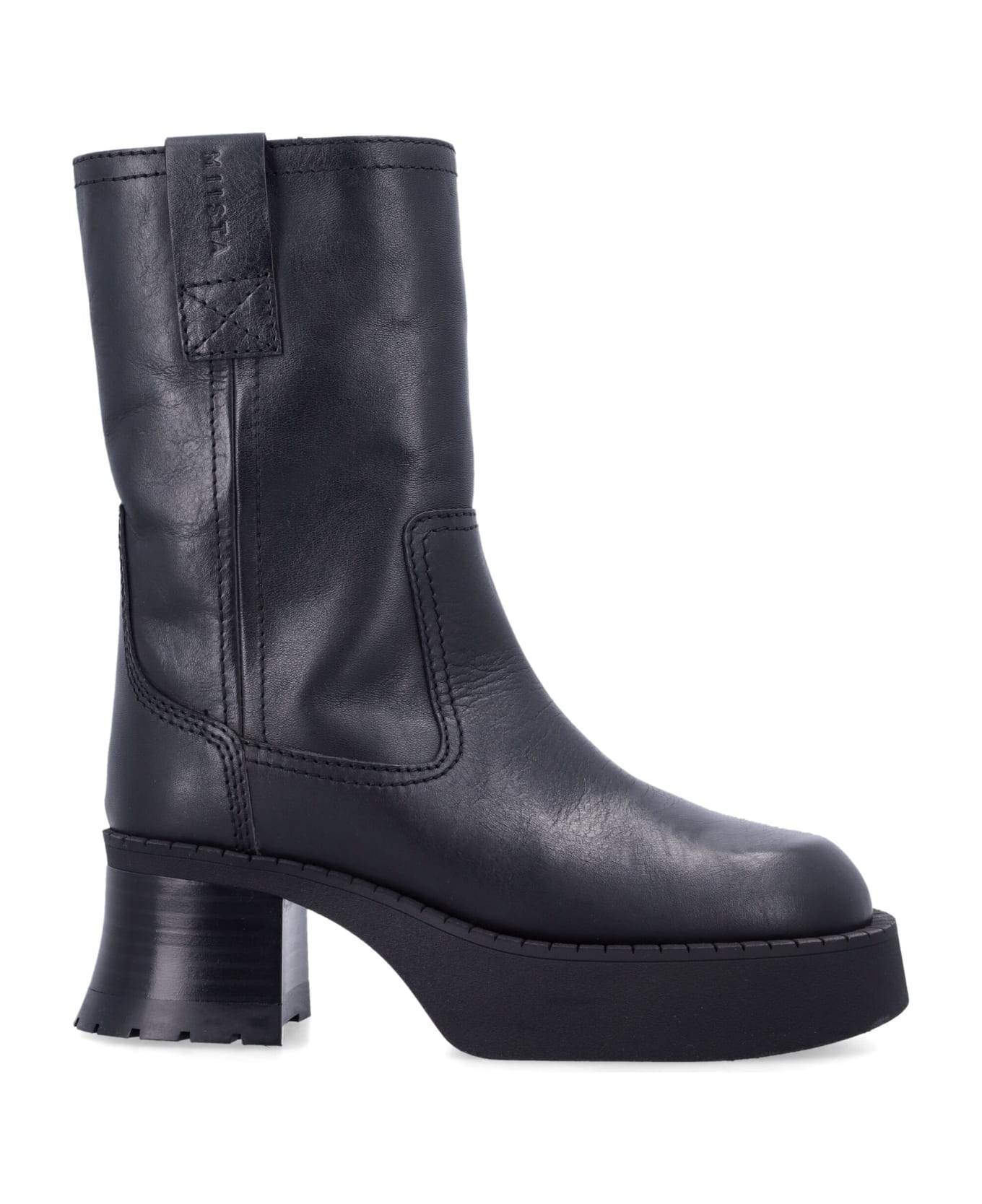 Annegret Ankle Boots By Miista. Featuring: Smooth Leather Construction Mid-calf Height With A Slip-on Design Round Toe Chunky Block Heel Thick Platform Sole With Rugged Grip Side Pull Tabs With Embossed Miista Logo