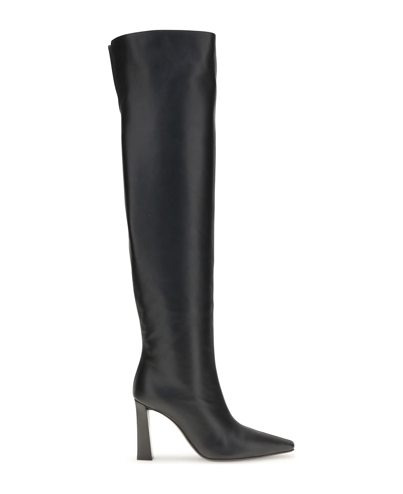 Giuseppe zanotti's extra high leather boots combine elegance and grit. made of soft leather, they feature an almond toe and a squared heel for stability and style. the above-the-knee height slims the leg, while the cutaway at the back adds a functional and sophisticated detail. a bold accessory, perfect for completing bold, contemporary looks.