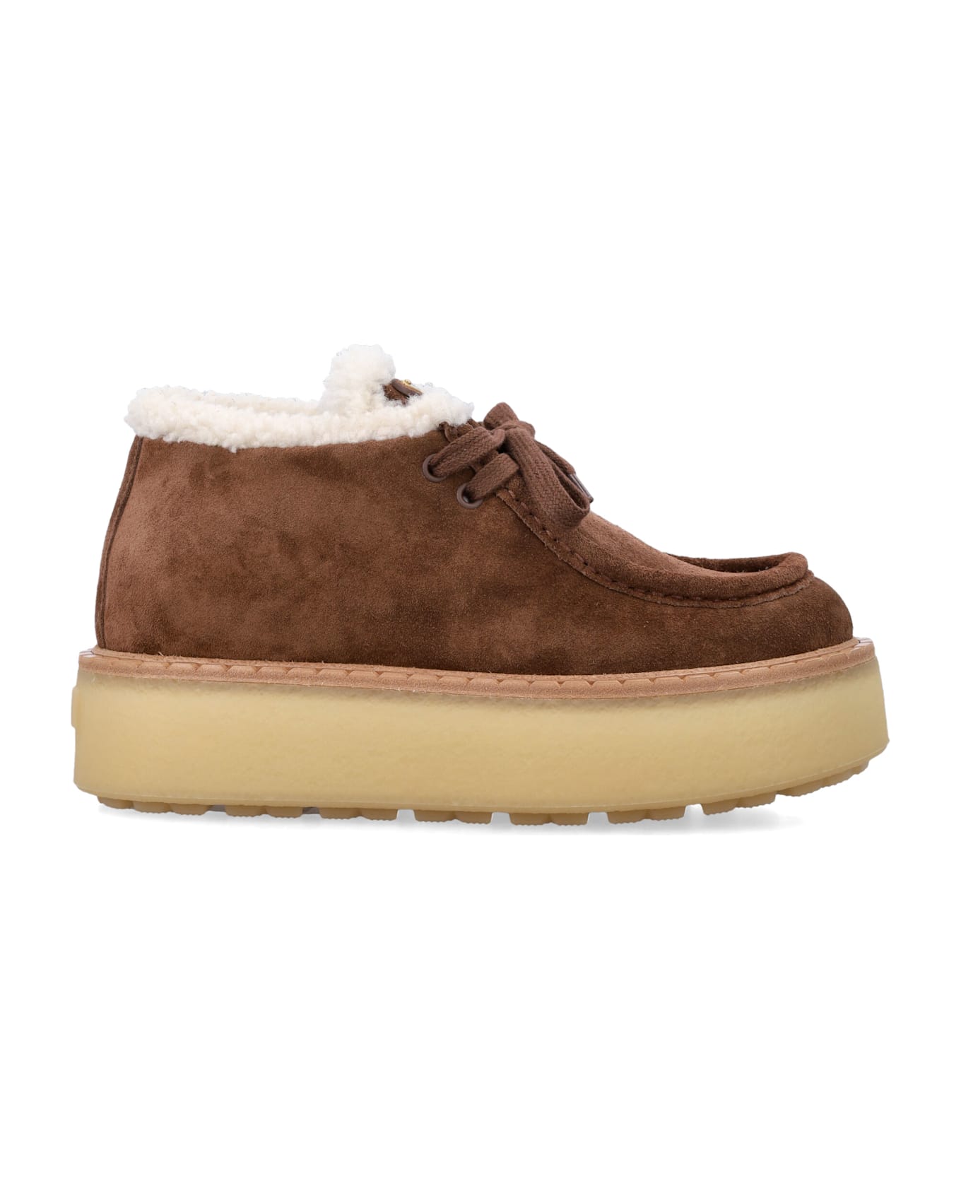 Prada s Suede Chukka Boots Bring A Contemporary Edge To A Timeless Silhouette. Featuring A Soft Shearling Lining For Warmth And Comfort, They Are Set On A Bold Rubber Flatform Sole With A Lug Tread For Traction And Durability. Detailed With The Iconic Enameled Metal Triangle Logo And A Notched Leather Welt, This Design Blends Refined Craftsmanship With Everyday Practicality, Ideal For The Colder Season. Premium Suede Upper Warm Shearling Lining Prada Enameled Metal Triangle Logo Lace-up Closure Rubber Flatform Sole Lug Tread Outsole Notched Leather Welt Removable Shearling-covered Insole Sole Height: 5 Cm