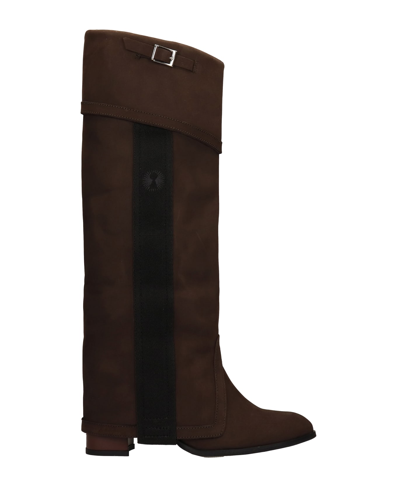 Serra High heels boots in brown nubuck, almond toe, cuffed hem, metal buckle, silver hardware, stirrup detail, heel 95 mm, Made in Italy