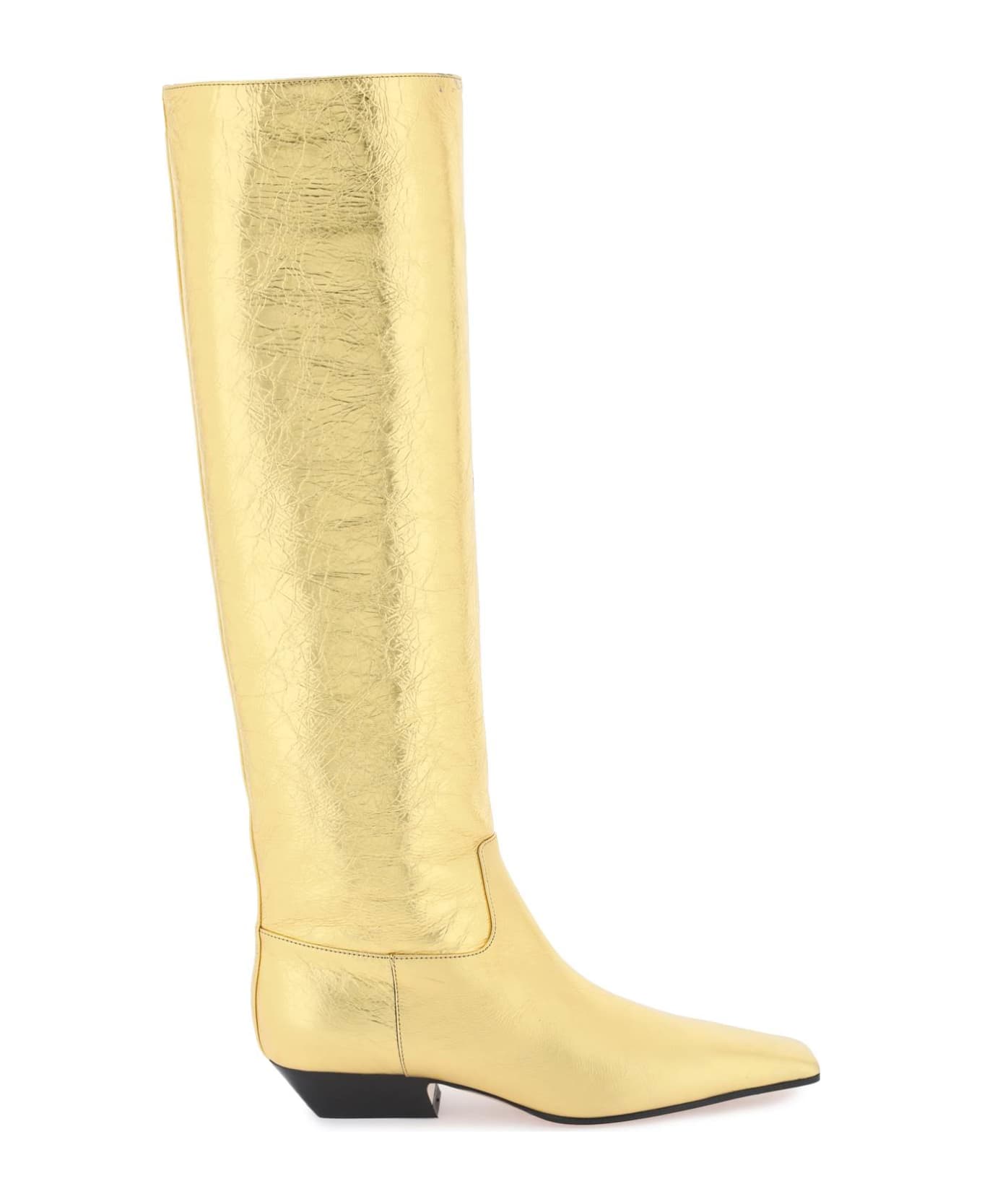 "The Marfa" knee-high boots from Khaite are made of crackled metallic leather with square toe, leather interior and leather sole. Composition: 100% calfskin