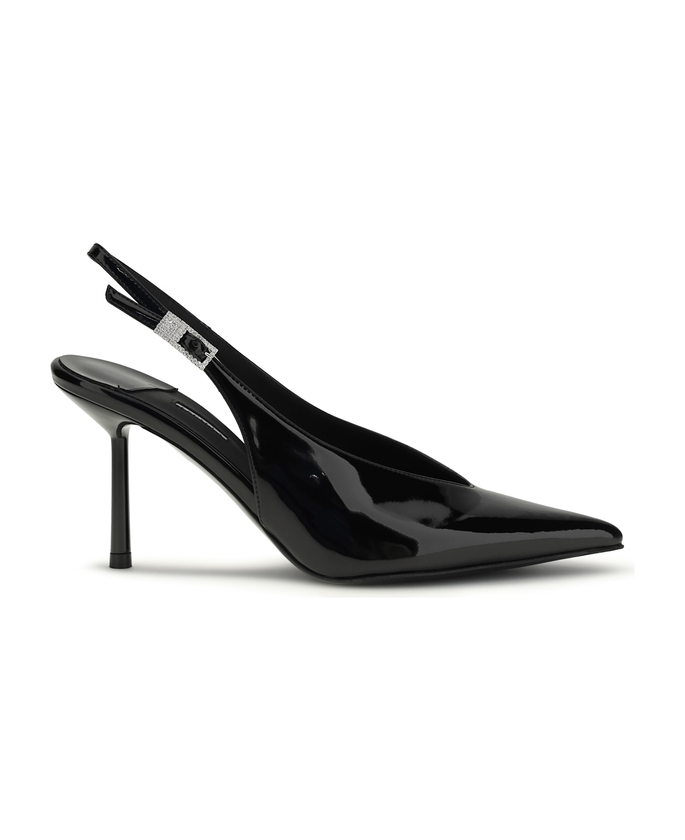 The clivage slingback pumps by le silla are the epitome of timeless sophistication. with their distinctive 80 mm stiletto heel and upper in fine black patent calfskin, these pumps are a true passe-partout for any occasion. the back strap, embellished with a striking silver crystal buckle, adds a touch of sparkle and sophistication, making these shoes ideal for those seeking elegance and comfort in a single footwear choice.