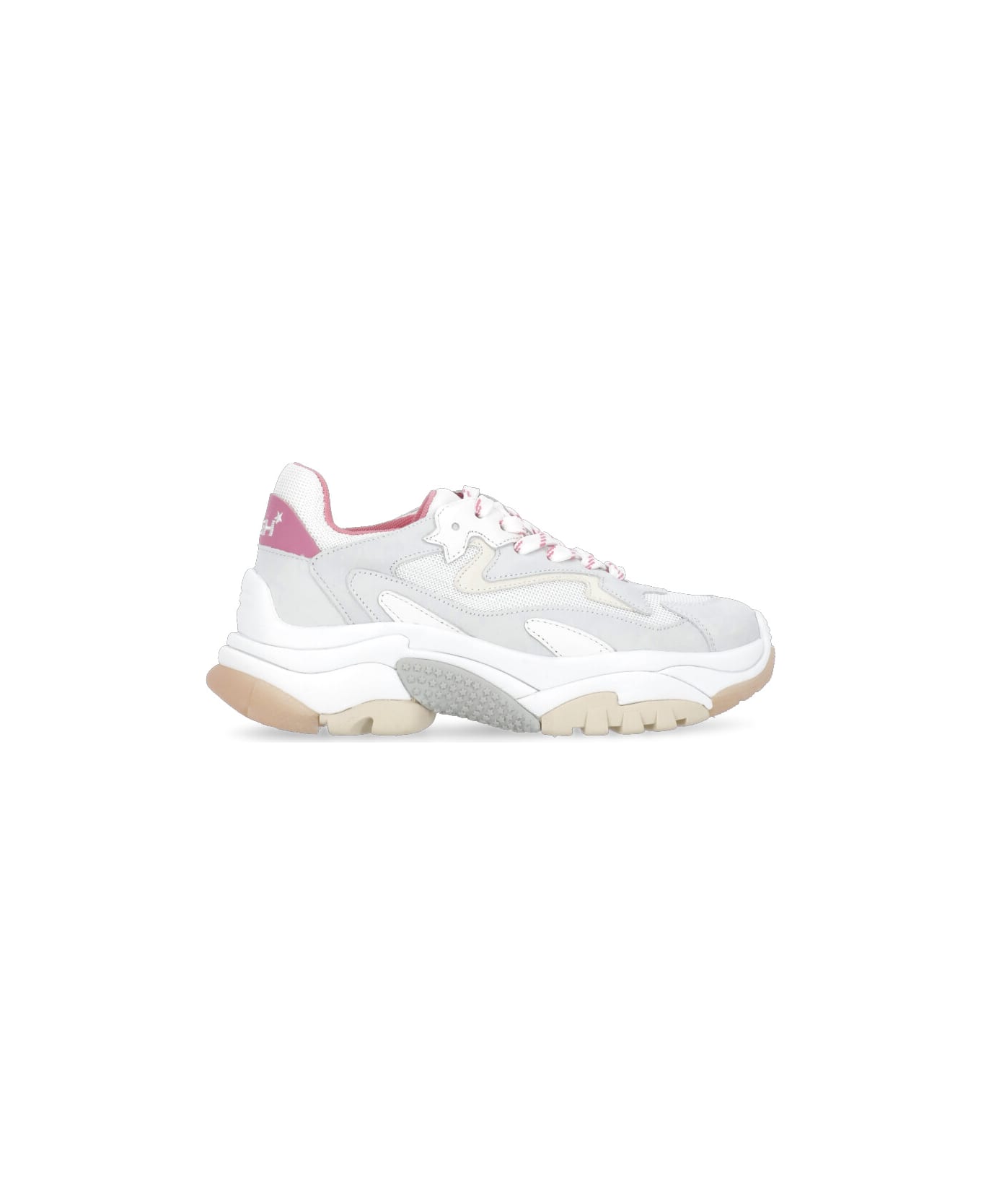 - White ASH leather sneakers for woman - Round toe - Front laces fastening - Contrasting colour and fabric inserts - Contrasting color logoed upper heel - Raised sole (5 cm)