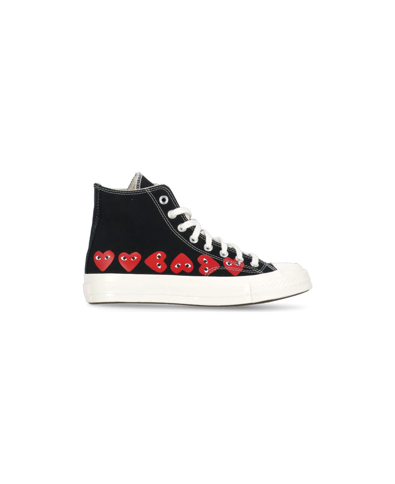 - Black Comme Des Garçons Play X Converse canvas high top sneakers for man and woman - Rubber round toe - Side contrasting color logo - Contrasting color logoed details - Rear tone on tone band - Laces fastening - Raised sole: 4 cm