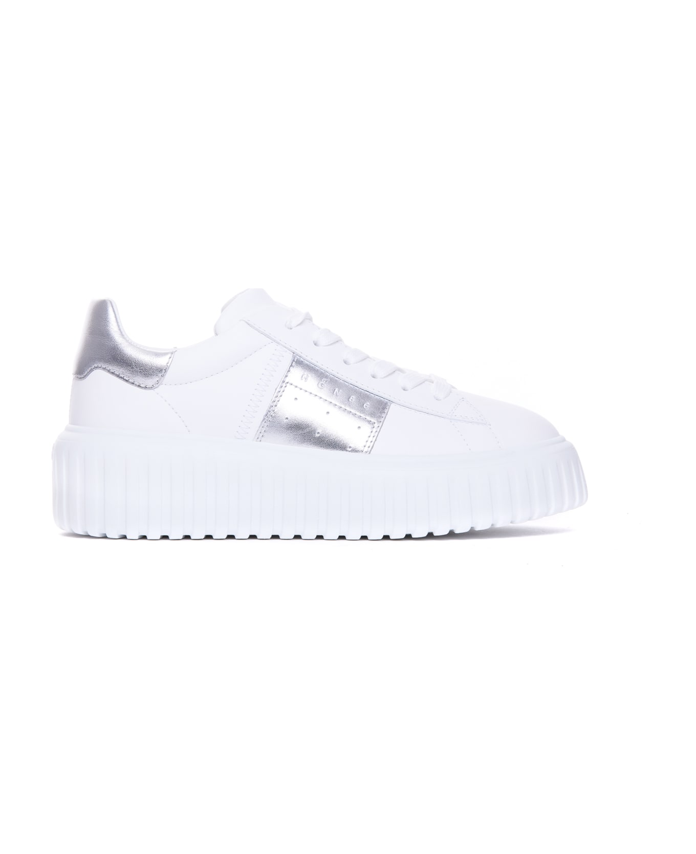 Hogan white and silver H-Stripes sneakers, round toe, lace closure, tongue, lateral and back logo, silver details, leather upper and rubber sole