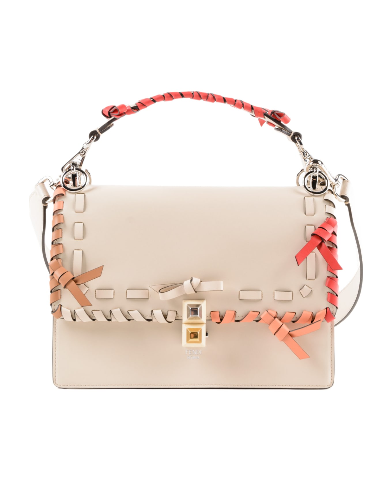 Kan I Shoulder Bag from Fendi: Beige Kan I Shoulder Bag with top handle, foldover top, clasp closure, detachable shoulder strap, multiple internal compartment and front logo detail.
