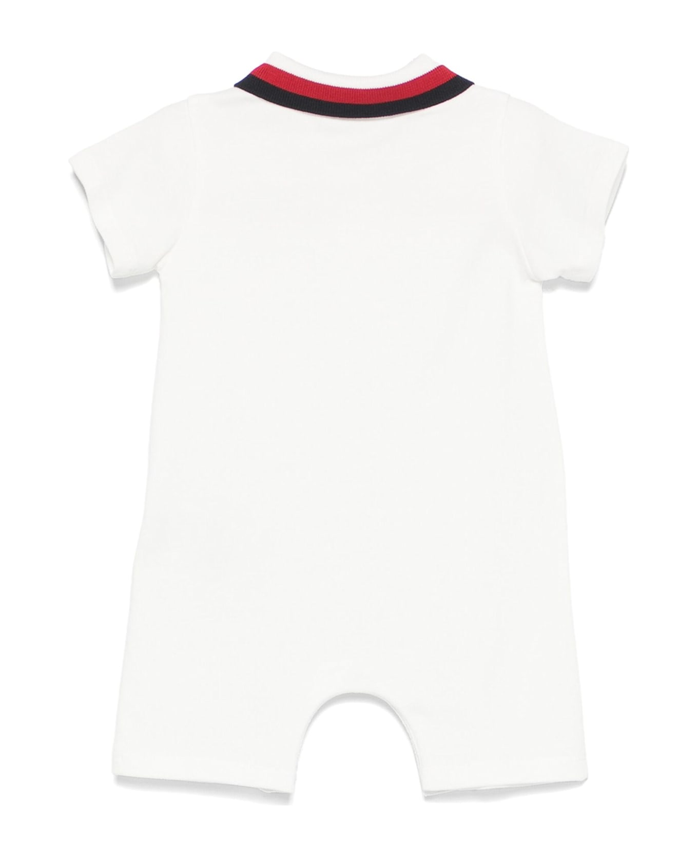 White Cotton romper, front button placket, polo collar, short sleeves, stripe detailing