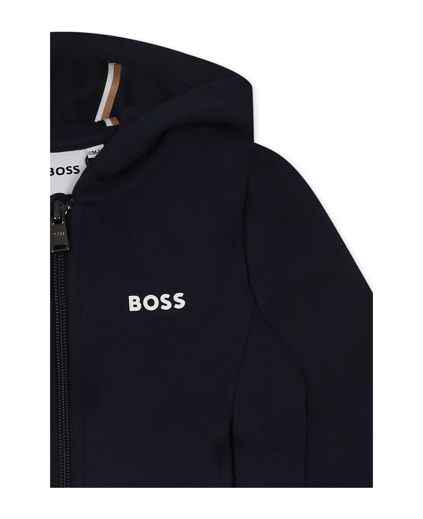 Blue suit in cotton blend, brushed, consisting of sweatshirt and trousers. Long-sleeved sweatshirt, with hood, front zip fastening, side pockets, striped cuffs and ribbed hem. It is embellished with logo on the chest. Trousers with striped elasticated waist, side pockets and ribbed ankles; embellished with a logo patch on one side.