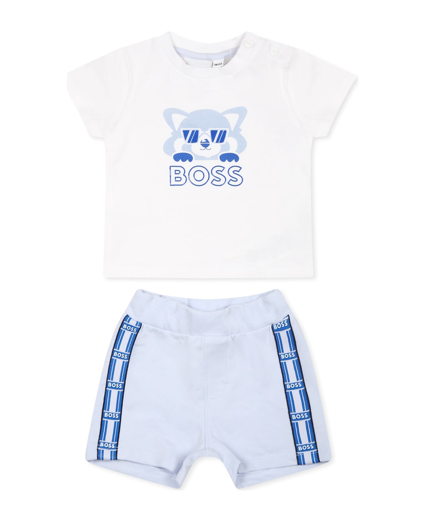 Multicolor suit composed of a t-shirt and shorts, in a blend of organic cotton, consisting of a t-shirt and shorts. White short-sleeved t-shirt, ribbed crew neck and snap button fastening on the shoulder. It is embellished with panda with sunglasses and logo on the front. Brushed shorts, with an elasticated waist and logo bands on the sides.