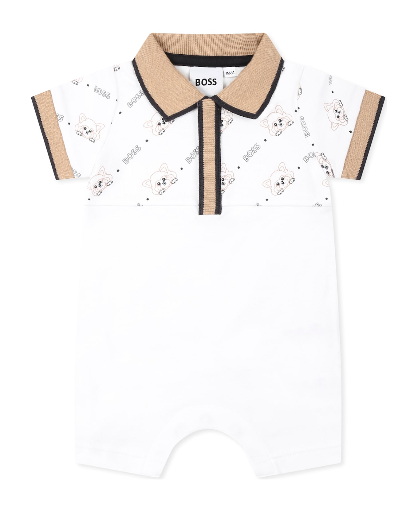 White romper in cotton piquet, short sleeves, with beige collar, press studs on the front and between the legs and contrasting beige details. It is embellished with logo monogram and all-over panda, on the upper part.