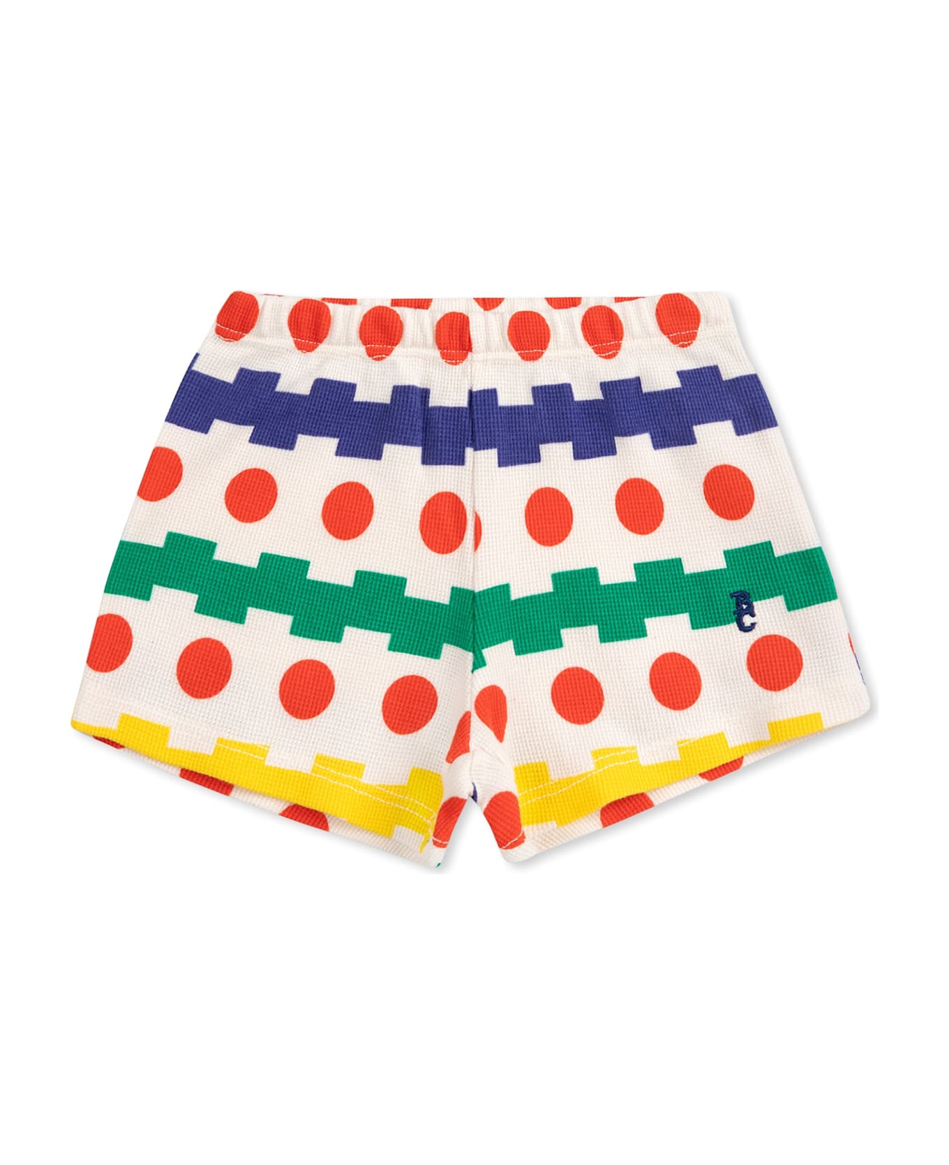 White shorts in organic cotton, with elasticated waist. They are embellished with an all-over geometric print and an embroidered logo on the front.