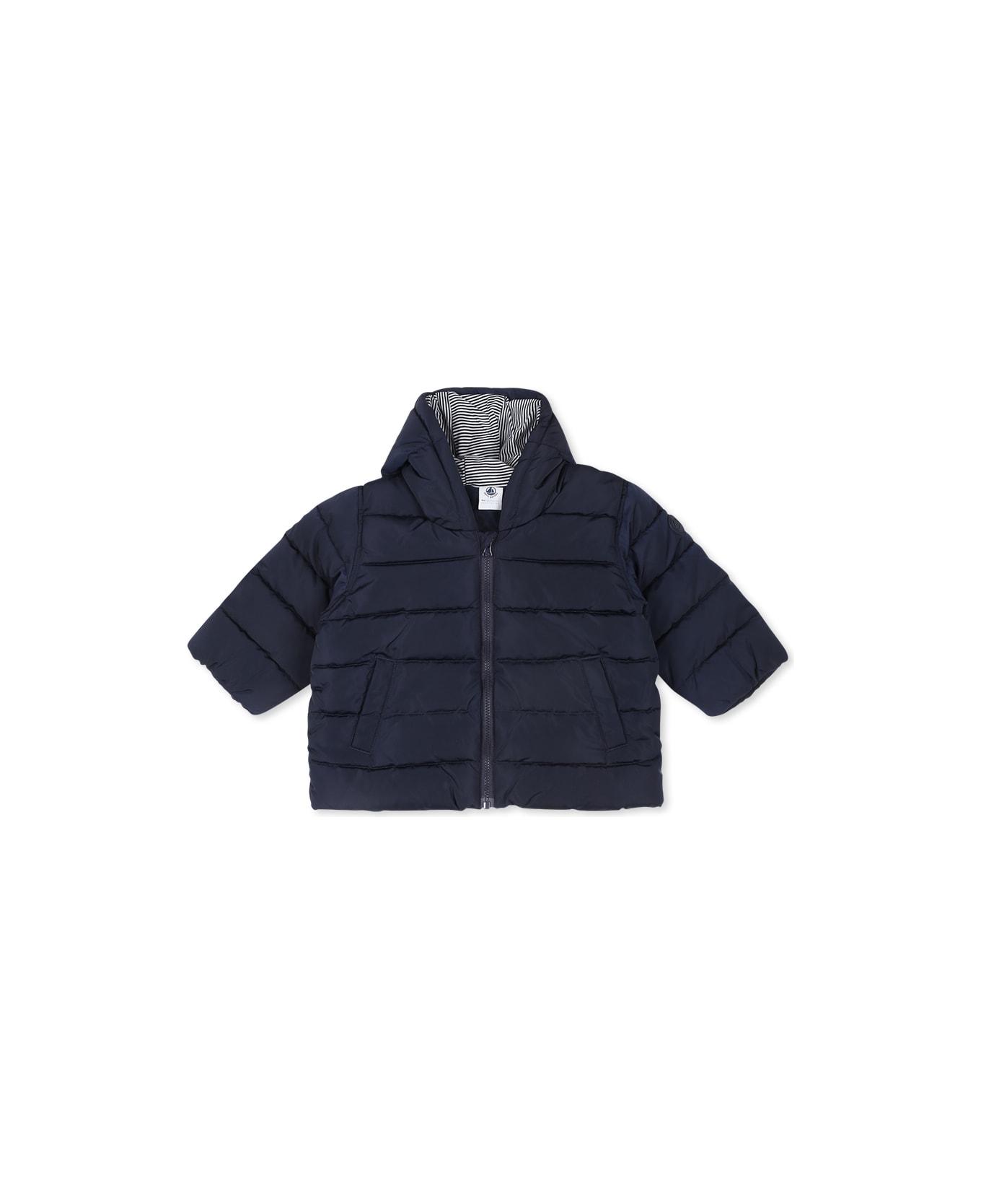 Heavy blue down jacket, in recycled polyester, padded and quilted, micro fleece interior, long sleeves, with hood with striped pattern inside, front zip closure, side pockets, elasticated cuffs and hem. It is embellished with a logo patch on the sleeve.