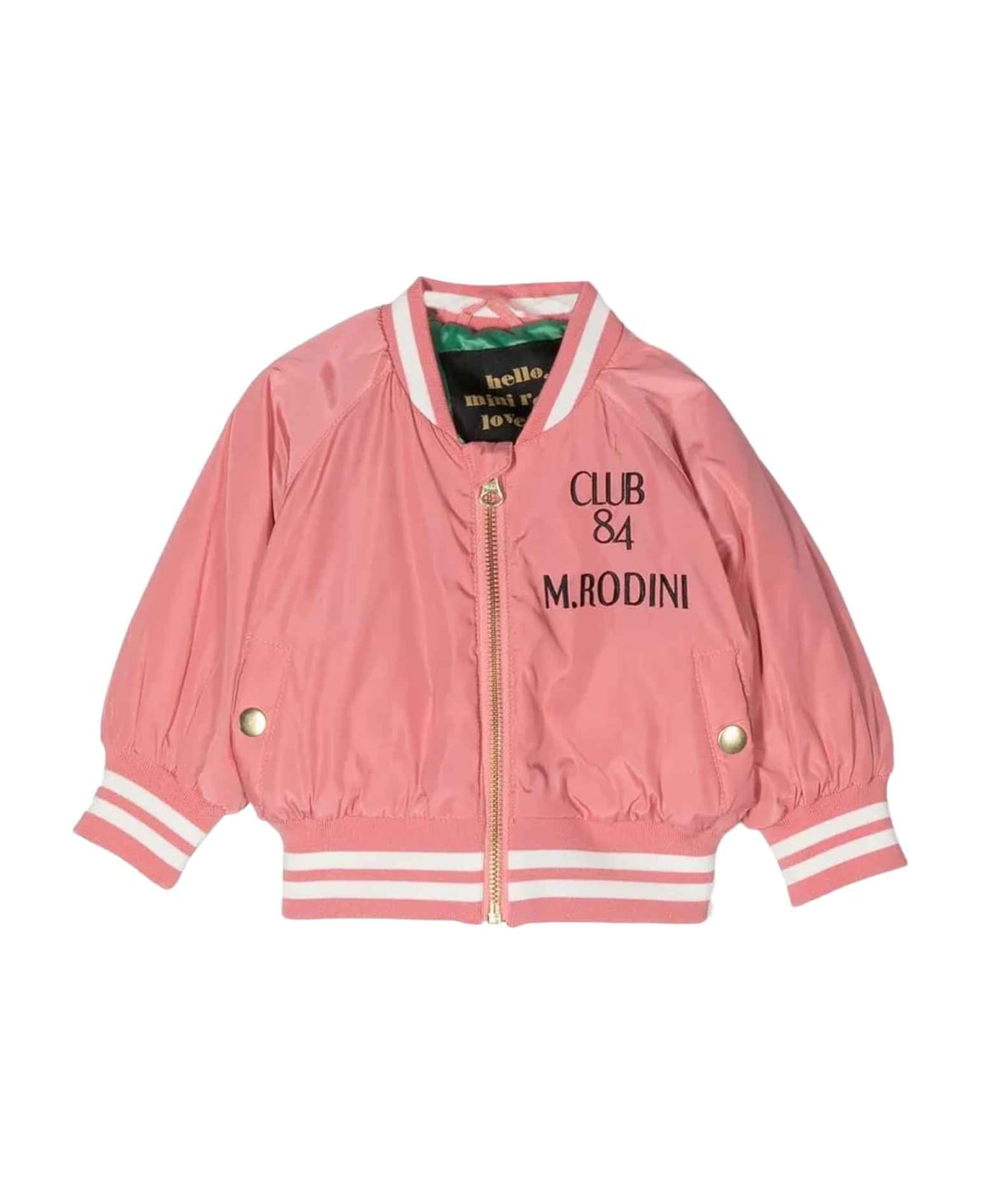 pink bomber jacket girl. Logo print on the front, front zip closure, two side pockets with snap buttons, long sleeves, gold-tone details, embroidered logo on the back and curved hem. 100% Recycled Polyester