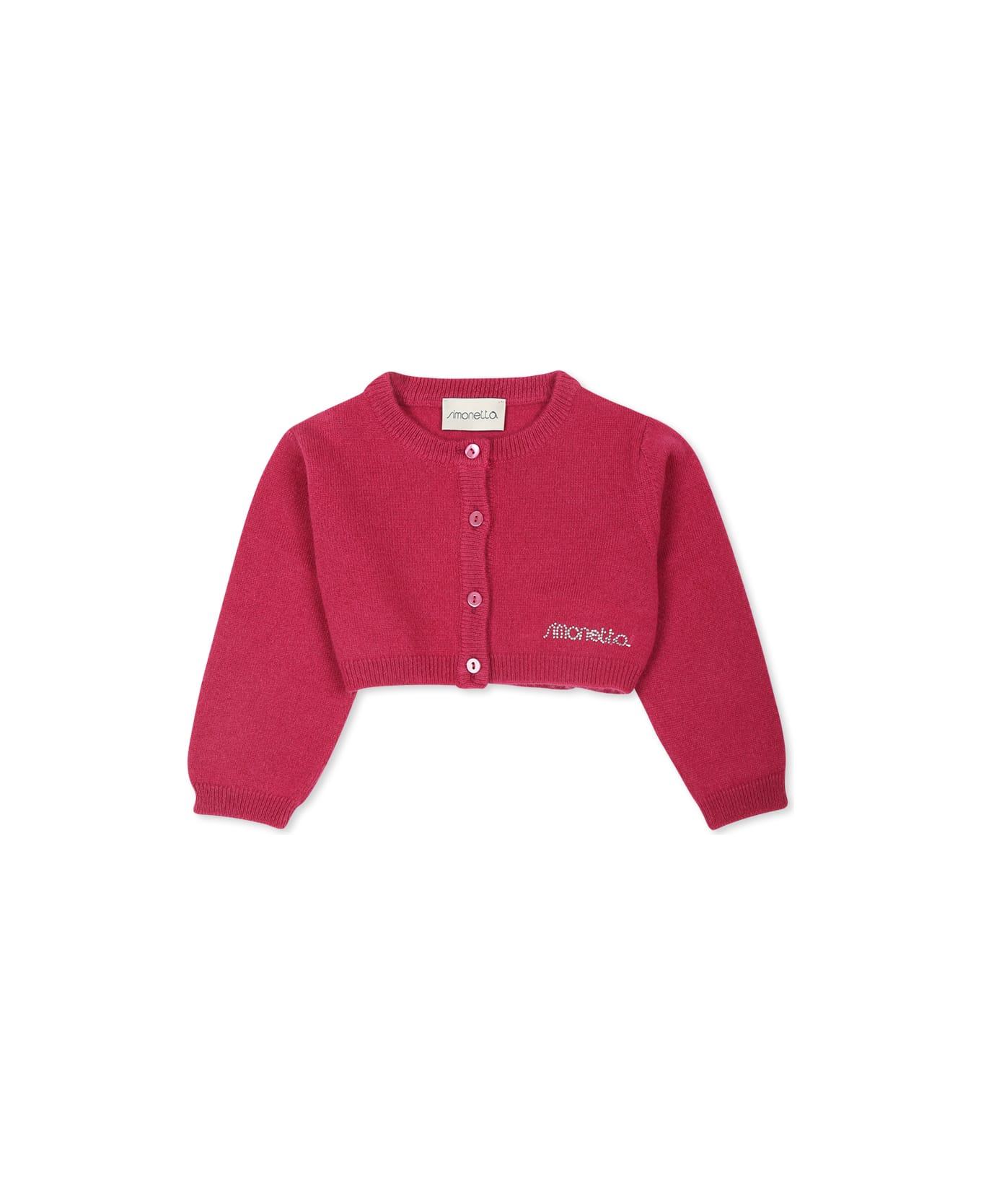 Fuchsia cashmere crop cardigan, long sleeves, ribbed crew-neck, front button closure, ribbed cuffs and hem. It is embellished with rhinestone logo on the front.
